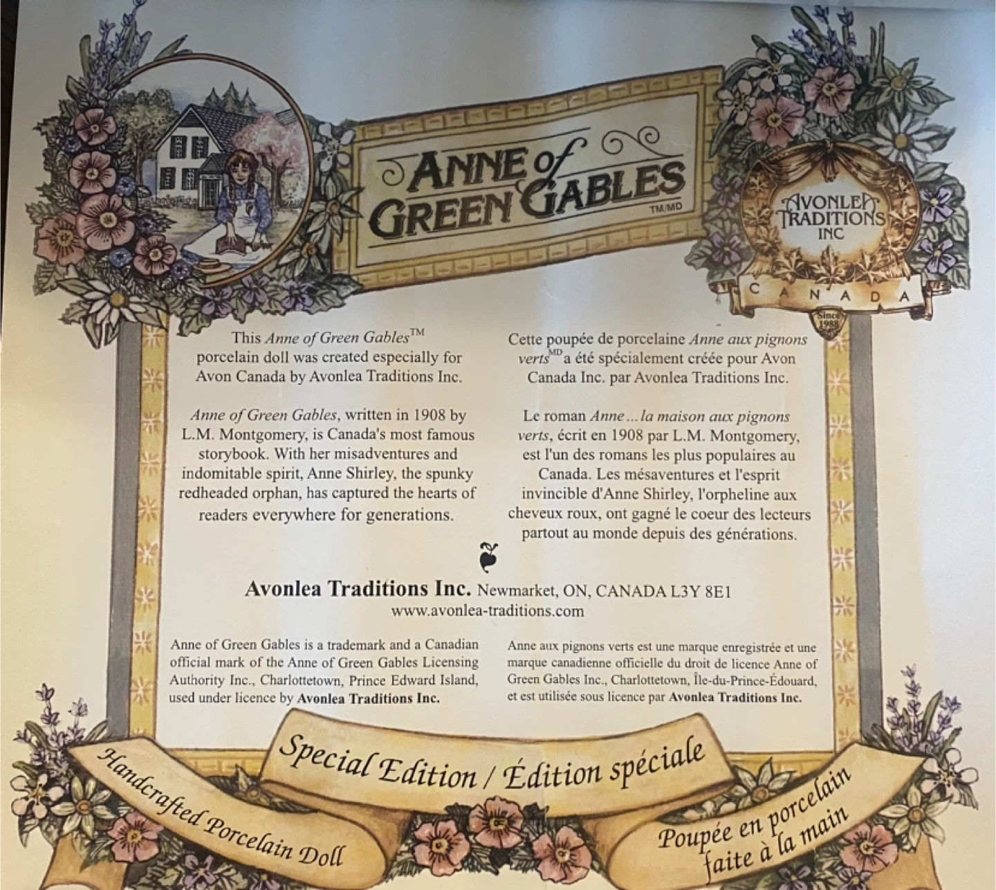 Selling a special edition Anne of Green Gables handcrafted porcelain doll by Avonlea Traditions Inc. This doll is a beautiful representation of the beloved character from L.M. Montgomery's famous story. A perfect addition for collectors or fans of Anne of Green Gables!