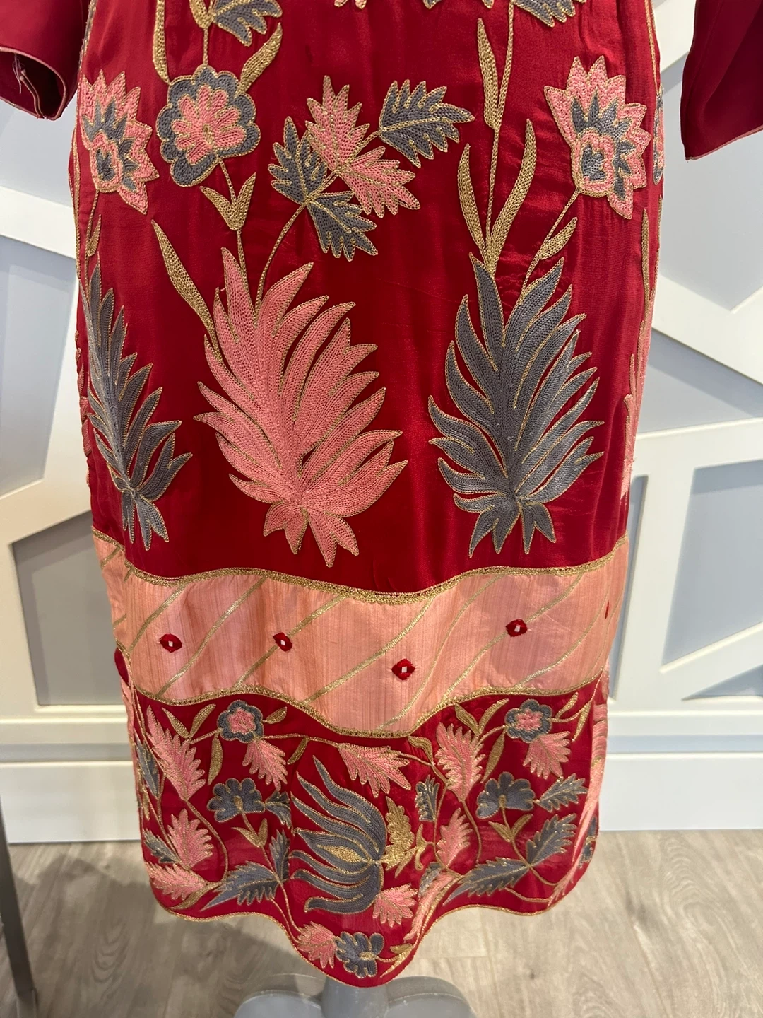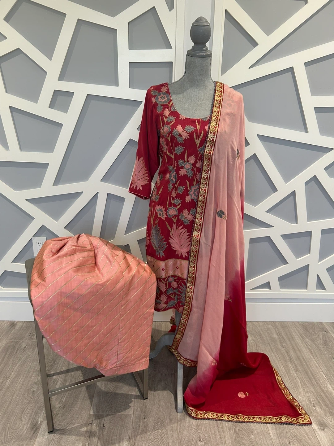 Beautiful red salwar kameez with intricate embroidery. The set includes the kameez (top), salwar (pants), and a matching dupatta. Perfect for special occasions or cultural events!