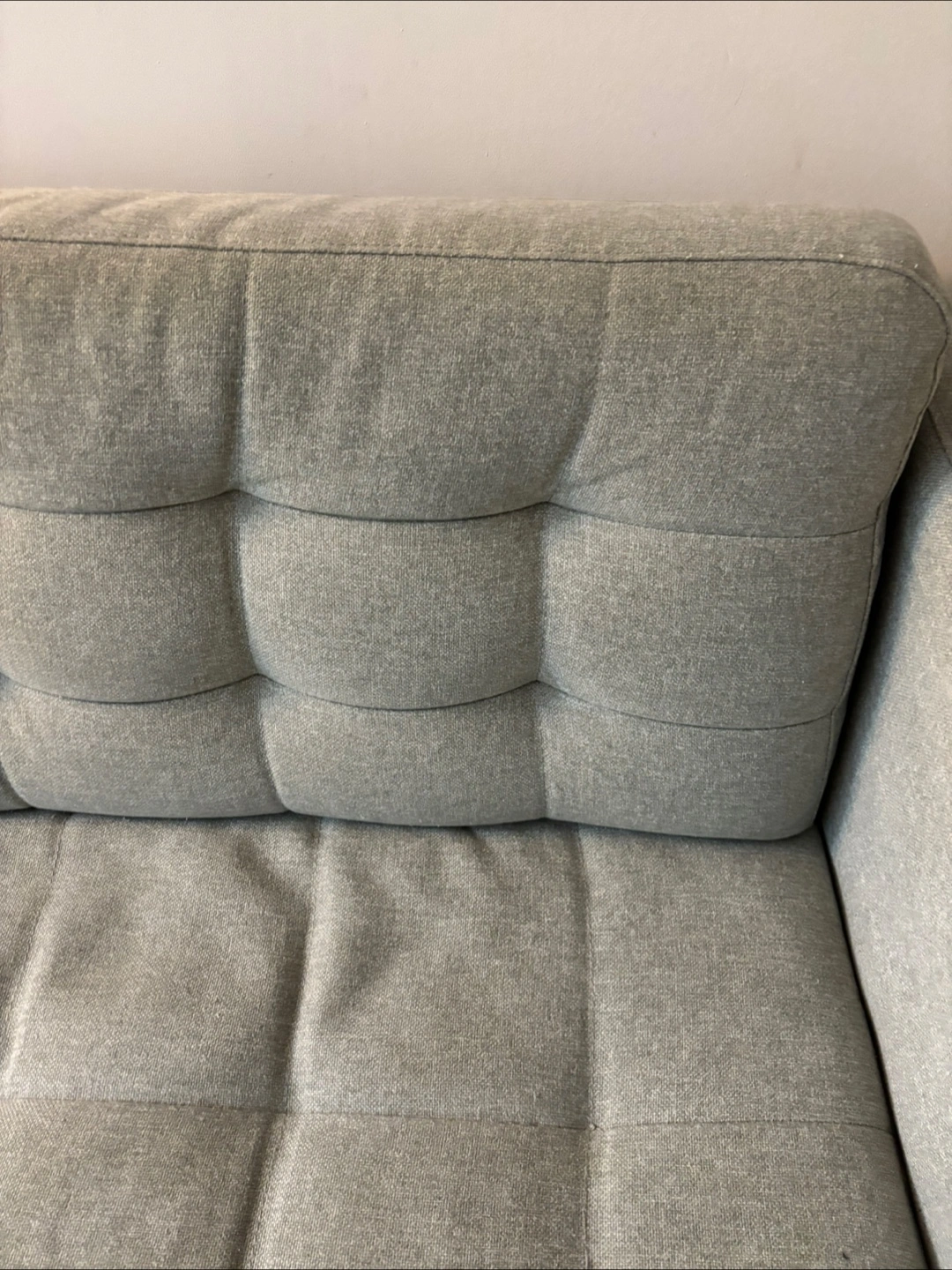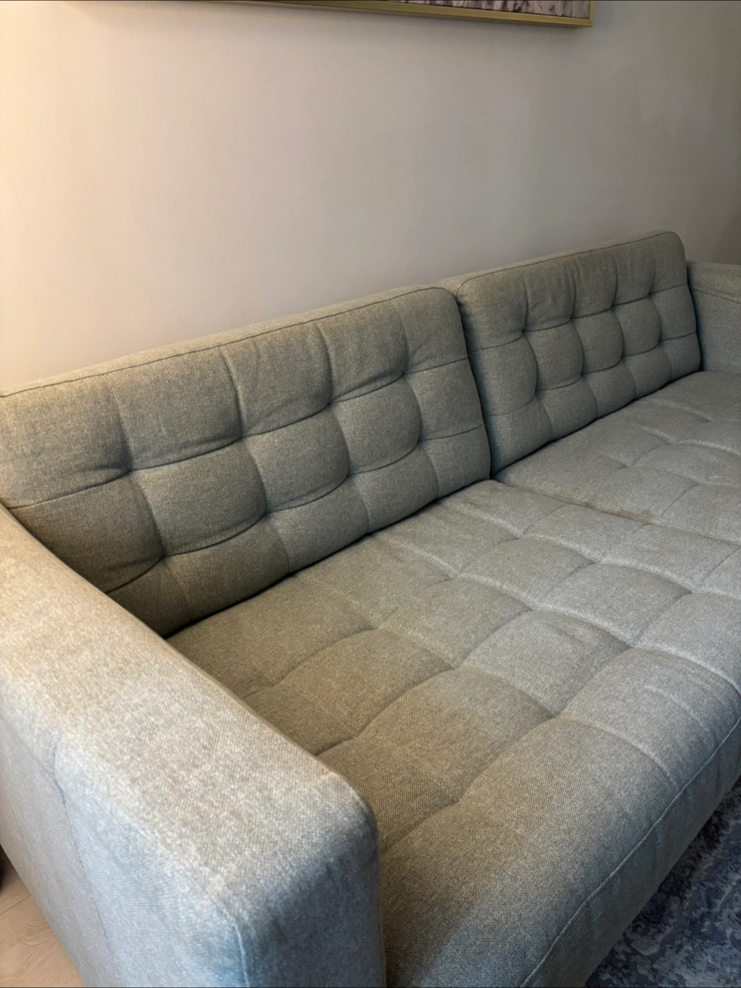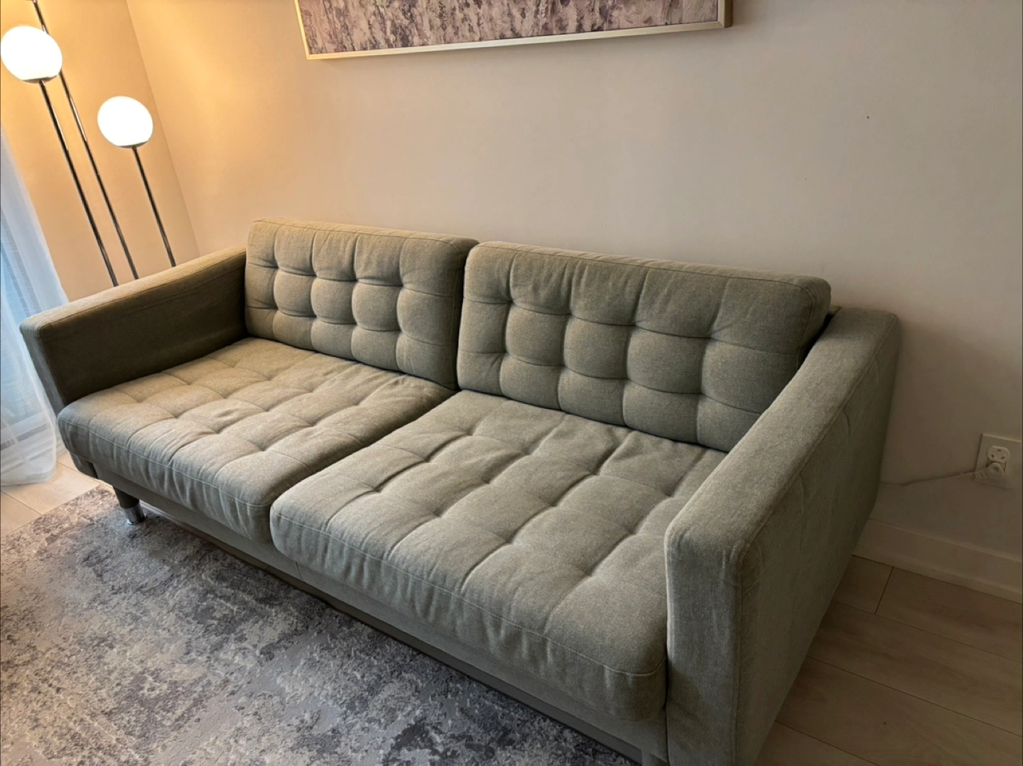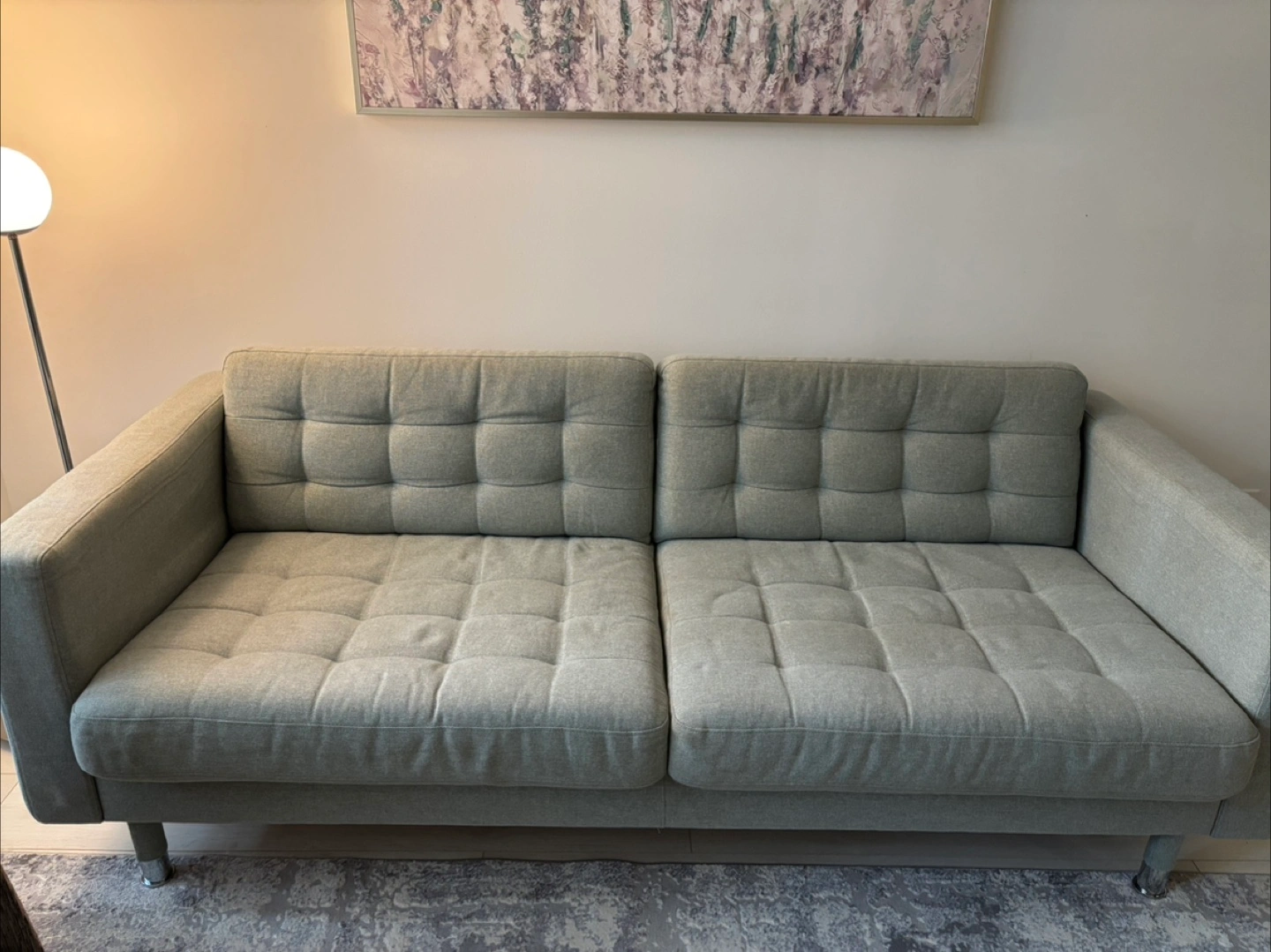 Selling a super comfy light green sofa from IKEA. It's in good condition and would be a great addition to any living room or den. The tufted design gives it a classic look, and the neutral colour makes it easy to match with other furniture.