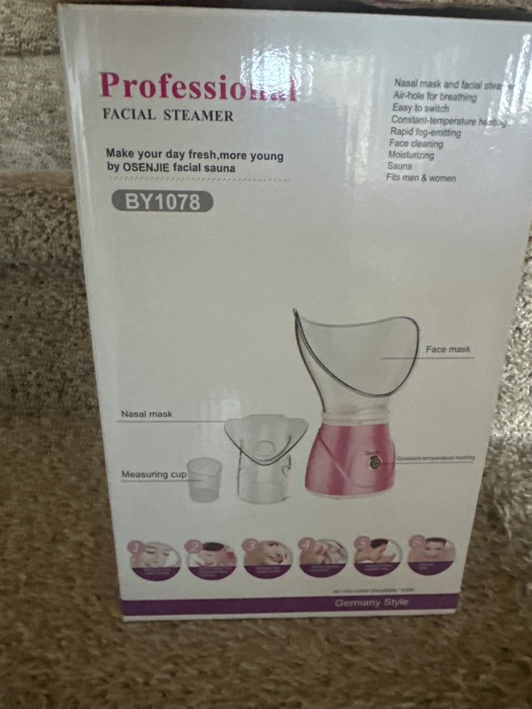 18I'm selling a professional facial steamer by Osenjie, model BY1078. It's designed to make your day fresh and young with Osenjie's facial sauna. Key features include: - Nasal mask and facial steamer - Air-hole for breathing - Easy to switch - Constant-temperature heating - Rapid fog-emitting - Face cleaning - Moisturizing - Sauna - Fits men & women