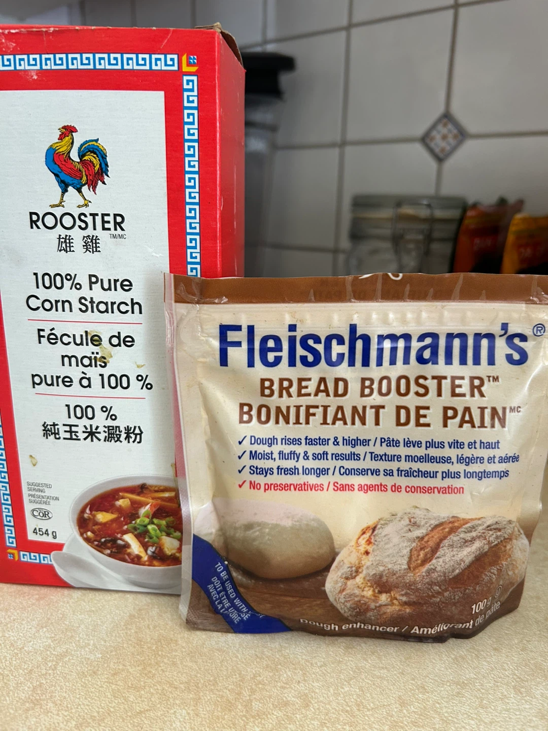 Selling a box of Rooster 100% Pure Corn Starch and a bag of Fleischmann's Bread Booster. The bread booster helps dough rise faster and higher and keeps it fresh longer. Great for baking!