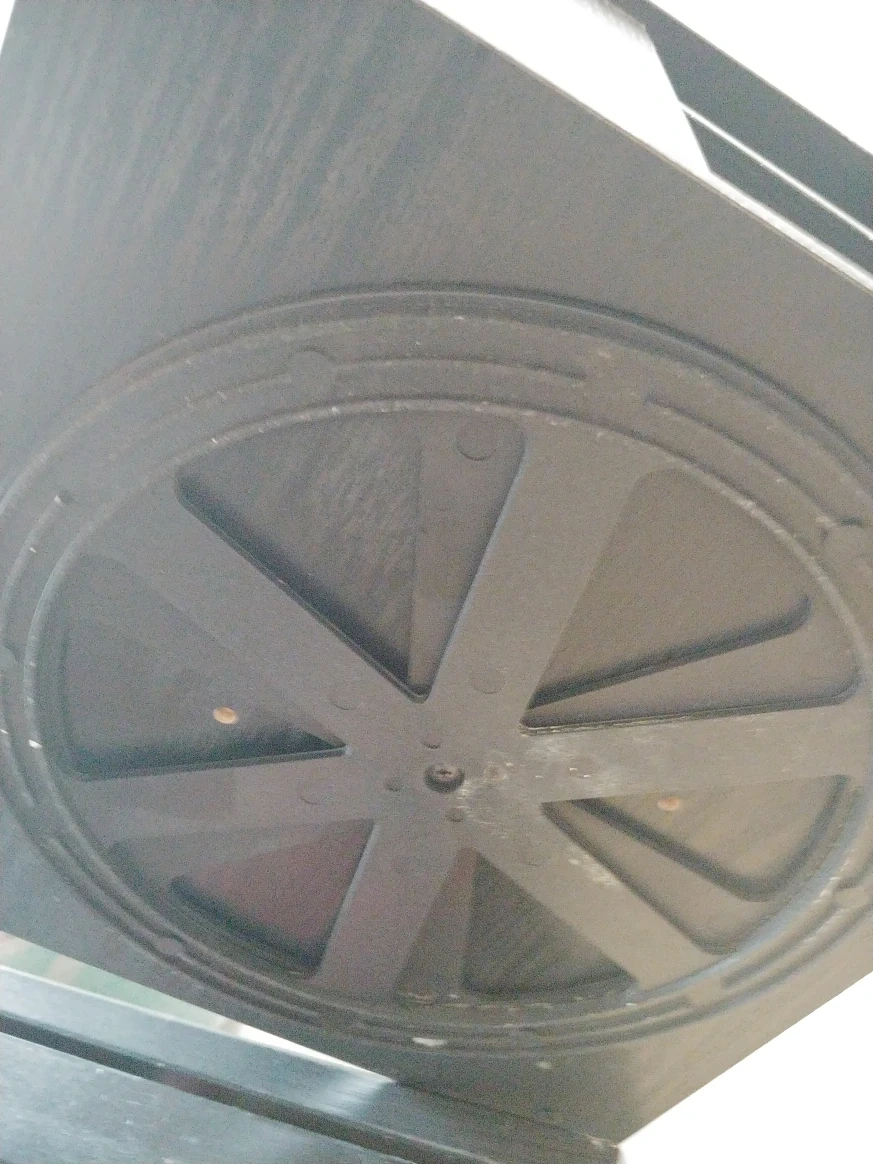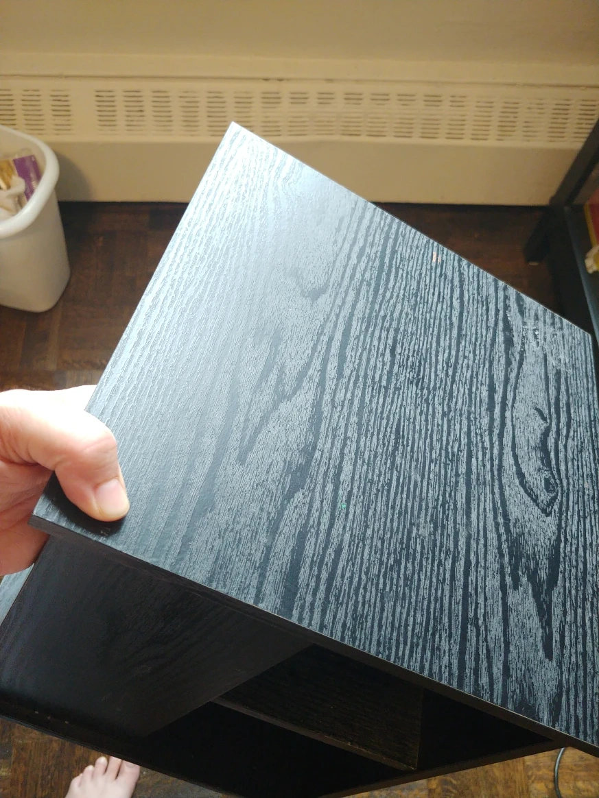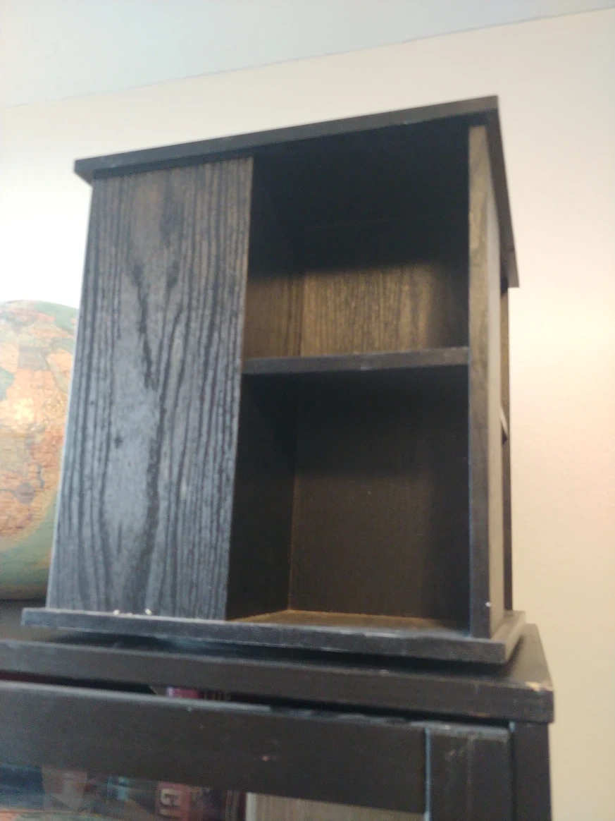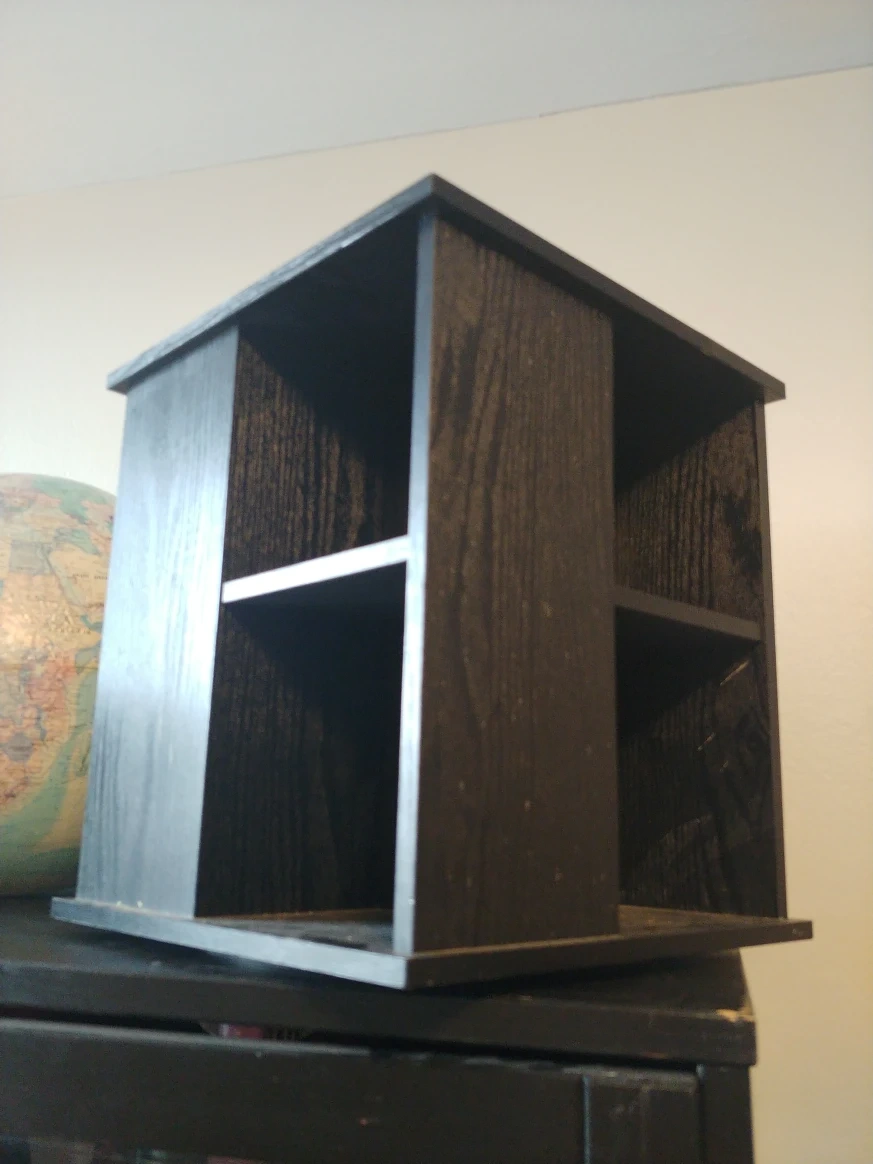 Measures 11.5 by 10.5 by 10.5". Some small cosmetic flaws but fully functional, rotates 180 degrees. Probably made of fibreboard.
