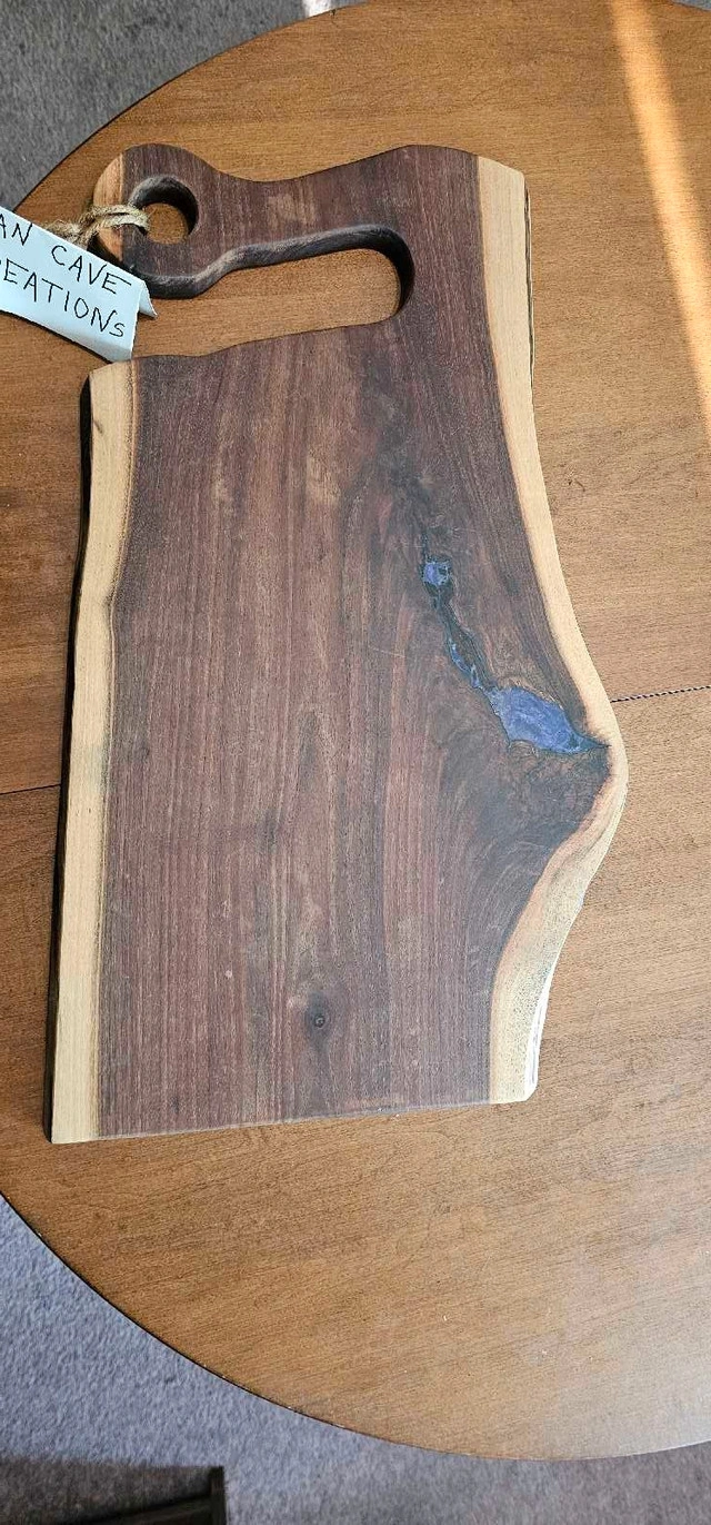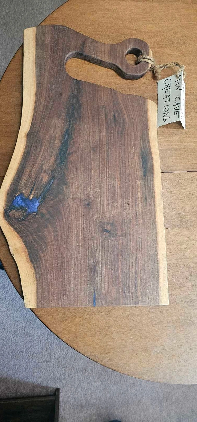 Add a touch of rustic elegance to your kitchen with this Man Cave Creations walnut charcuterie board. It's in excellent condition, ready to showcase your culinary creations. Features: * Material: Walnut wood with a unique live edge * Design: Includes a convenient handle for easy carrying * Detail: Inlaid with beautiful blue epoxy This charcuterie board is priced competitively based on similar items found on Kijiji, offering great value for its quality. Don't miss out on the chance to own this beautiful piece! If you're reading this, the charcuterie board is still available – so grab it before it's gone!