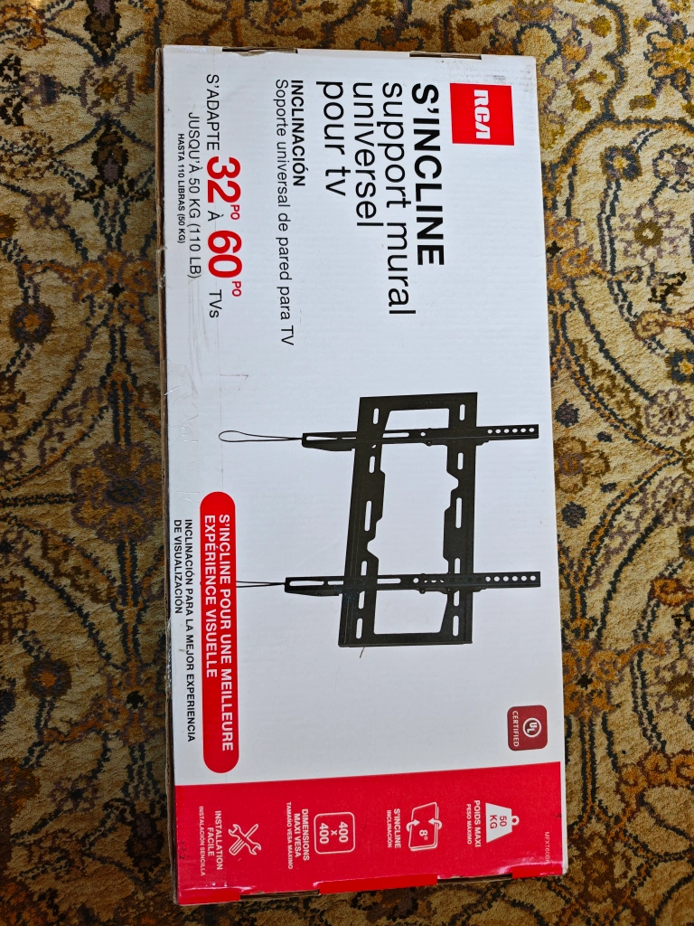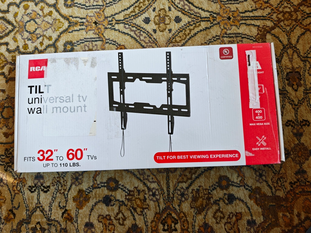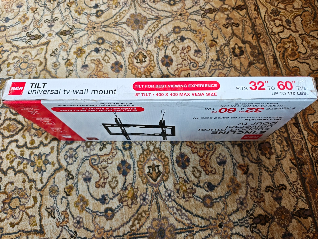 Selling an RCA tilt universal TV wall mount. It fits TVs from 32" to 60" and up to 110 lbs. It also has an 8" tilt and 400 x 400 max VESA size for the best viewing experience. Easy to install!