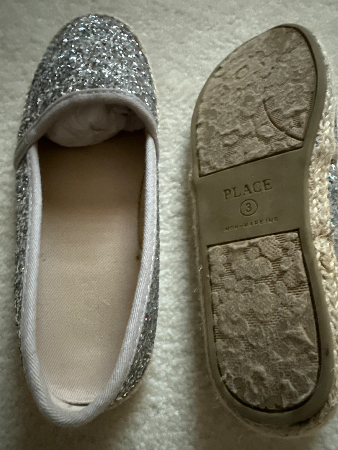 These adorable girls' shoes from Children's Place are perfect for adding a touch of sparkle to any outfit! They're a size 3 and covered in silver glitter. They show some signs of wear on the soles, but the glittery uppers are still in great shape