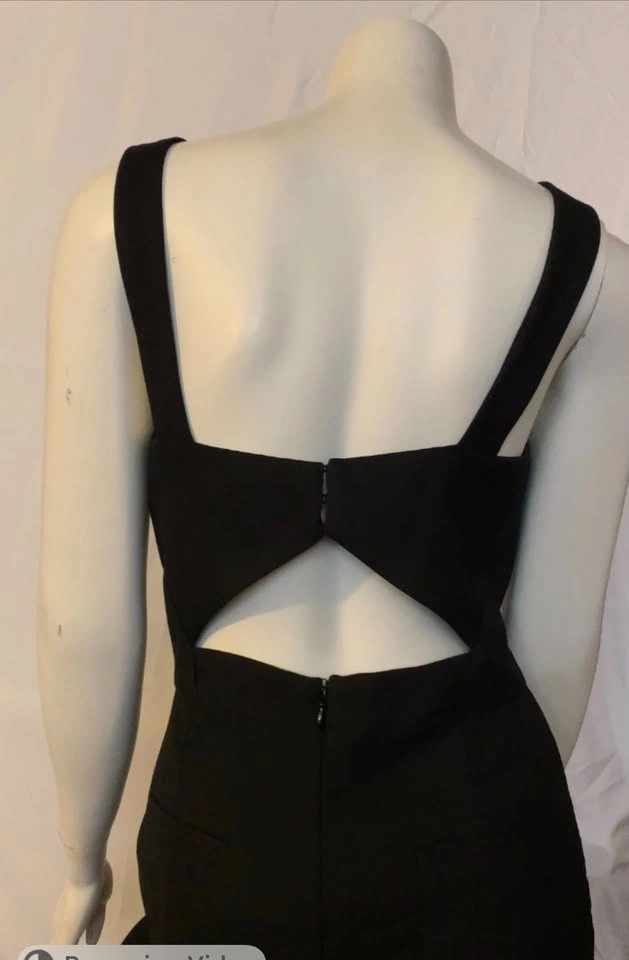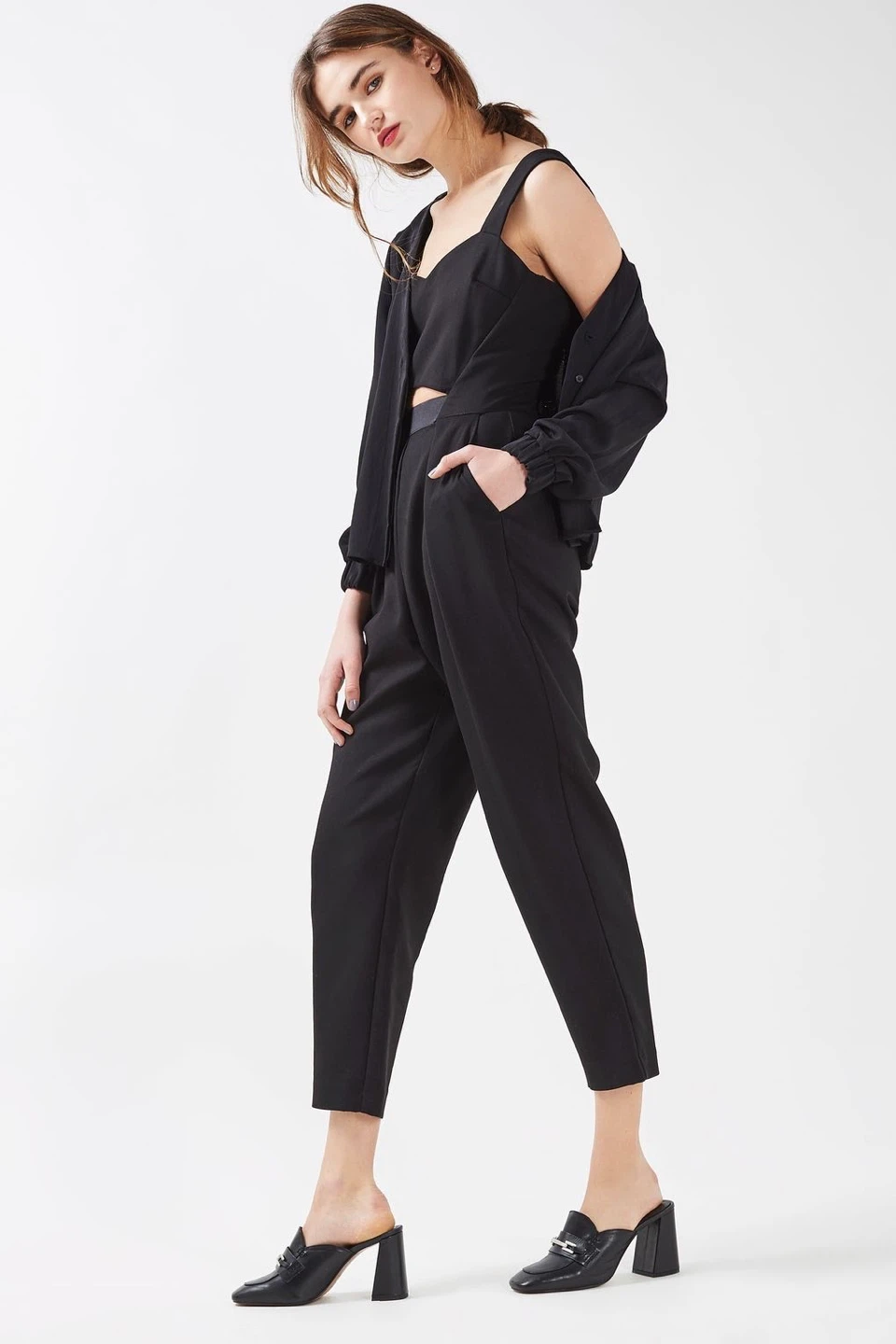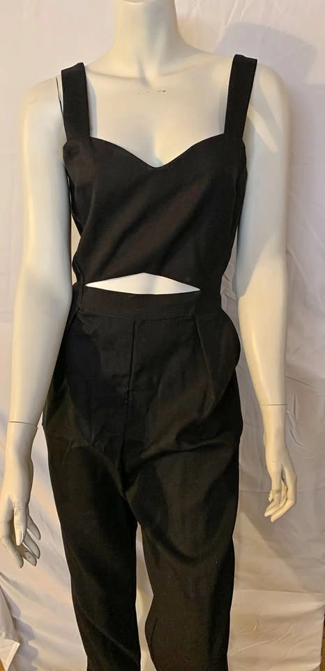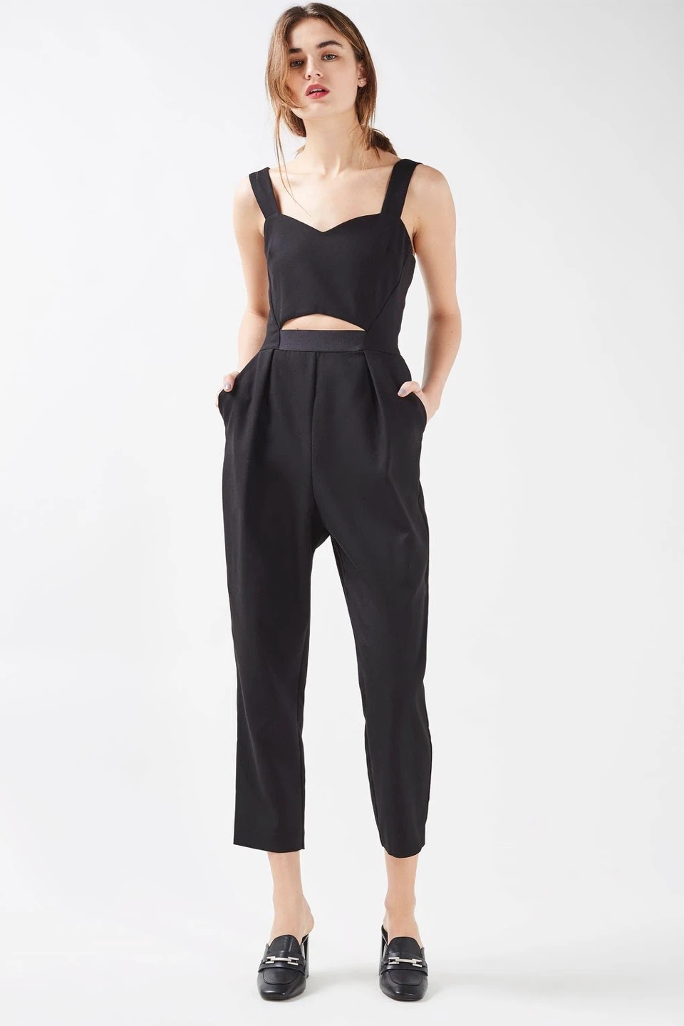 The jumpsuit transforms into a winning-party piece with this black jumpsuit, featuring a bustier top and cut-out to the front