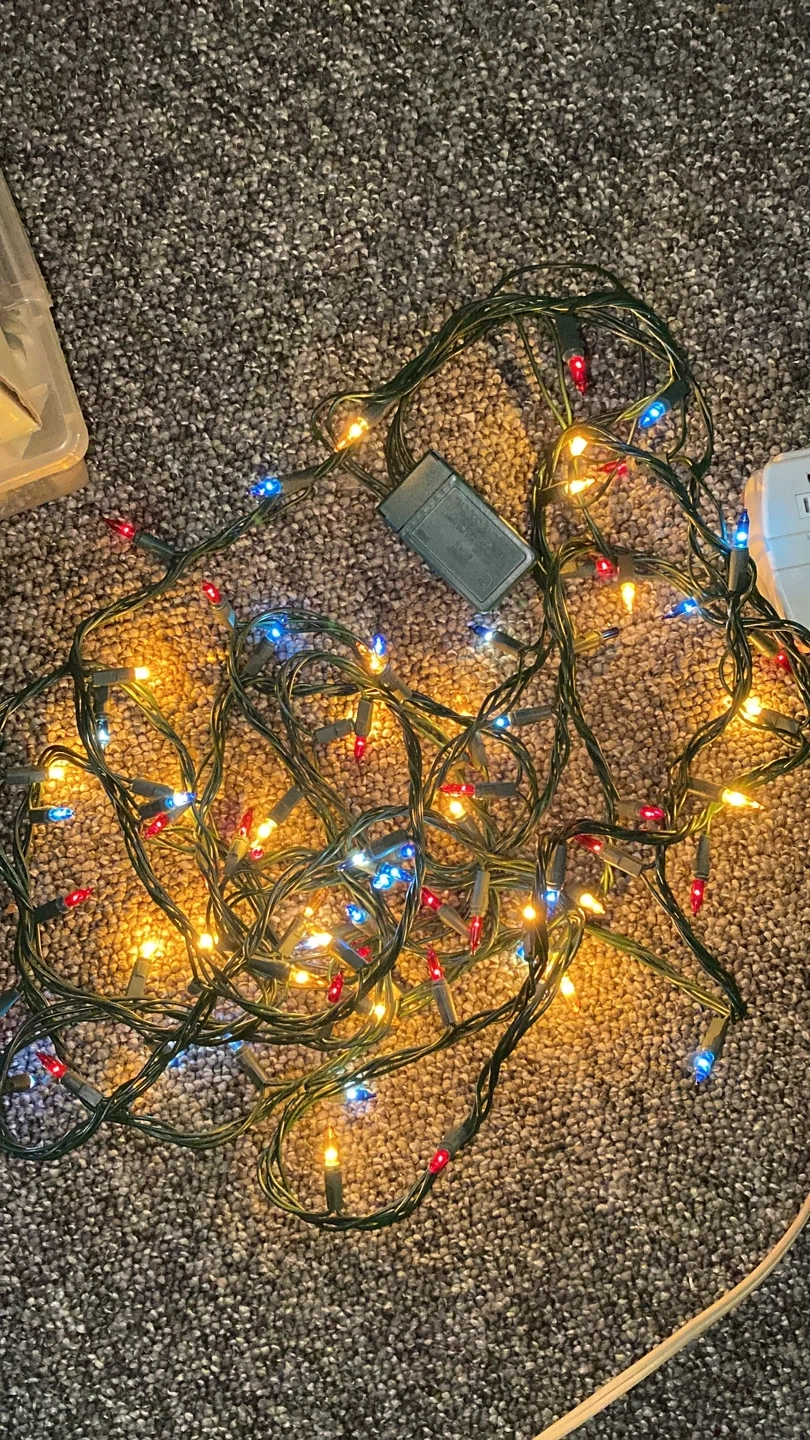 Selling 2 sets of Christmas indoor string lights! One set is multicolour -mix red, blue, and yellow bulbs on a green wire. One set is clear on green wire. Both are approximately 20 feet long. Perfect for adding a festive touch to your holiday decor! Moving sale Pick up only