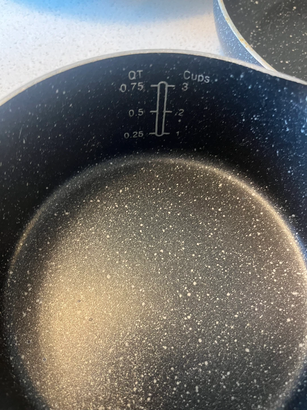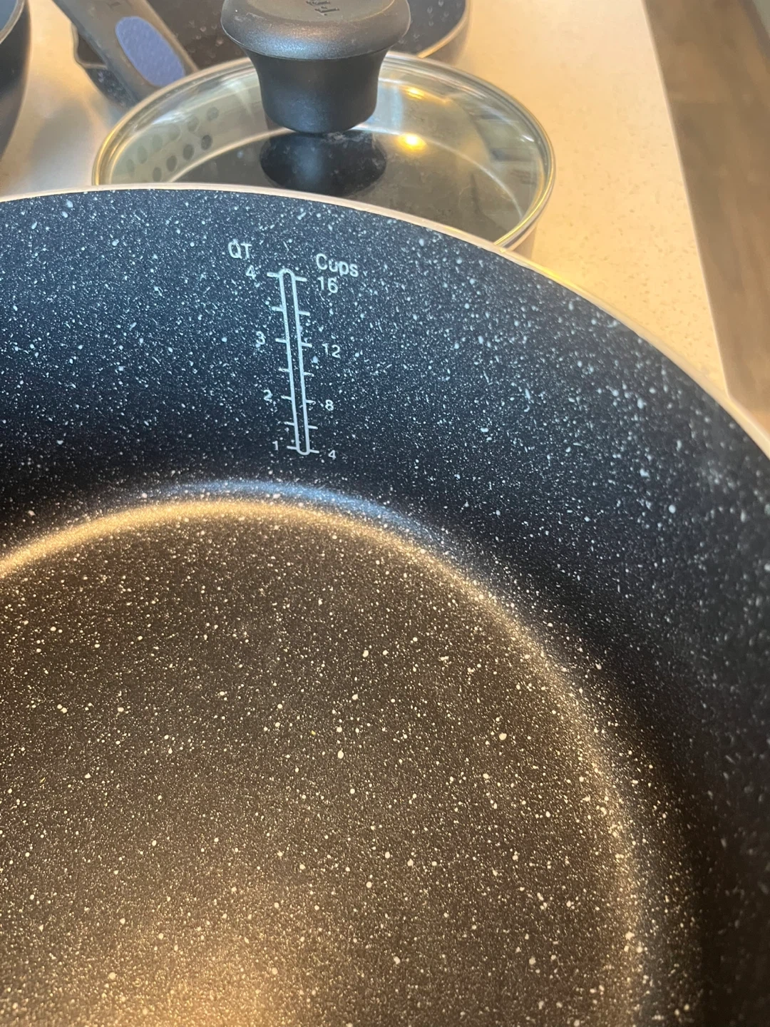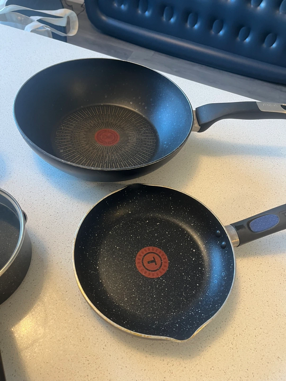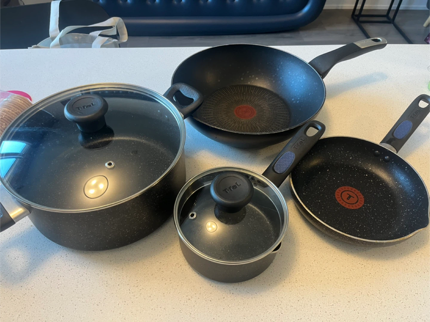 Selling a T-fal cookware set, including pots and pans. The set includes a wok, a frying pan, and two pots with lids. The pots are marked with measurements in quarts and cups.
