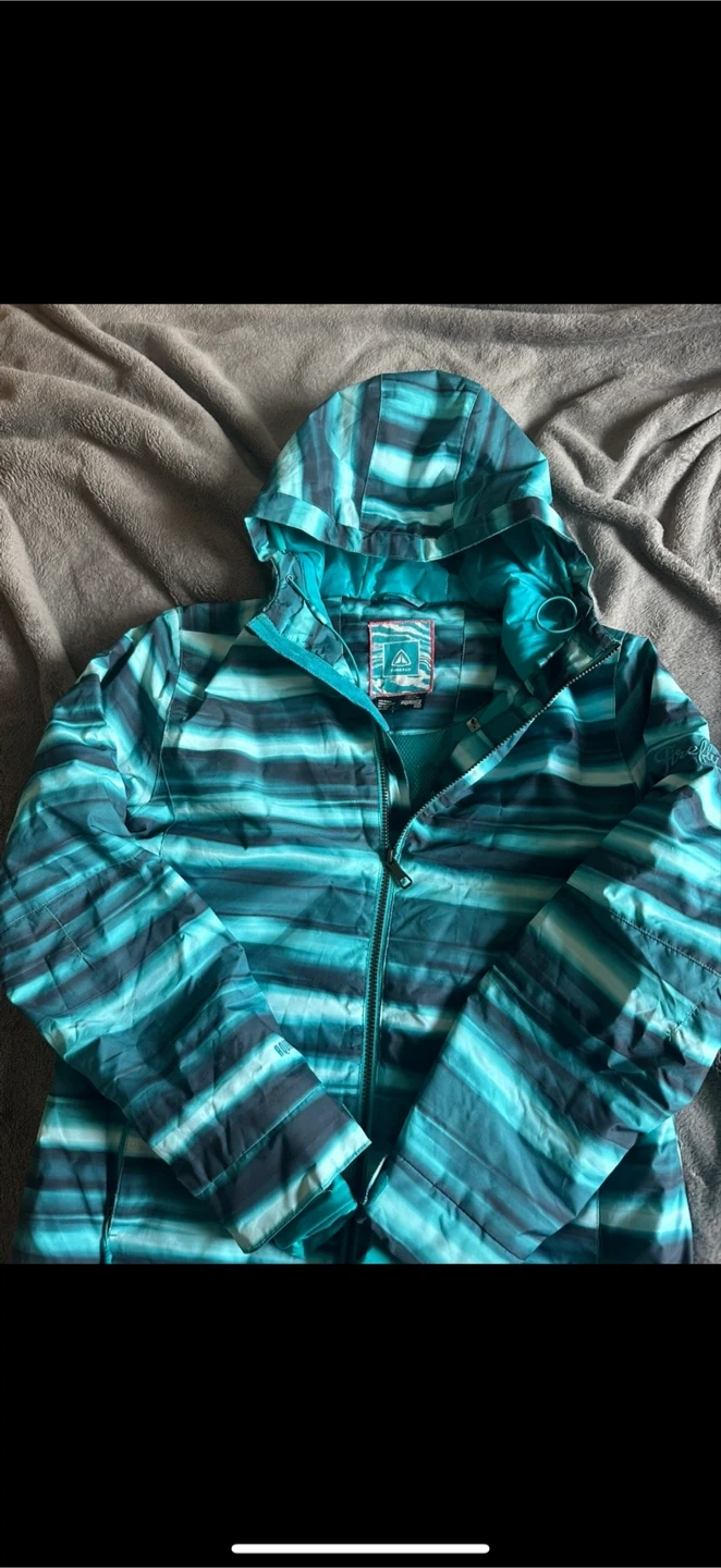 Selling a Firefly AquaBase Elite women's ski jacket in size LARGE. It's in great condition and ready for the slopes! The jacket features a stylish striped pattern in shades of blue and teal. Perfect for staying warm and dry this winter season