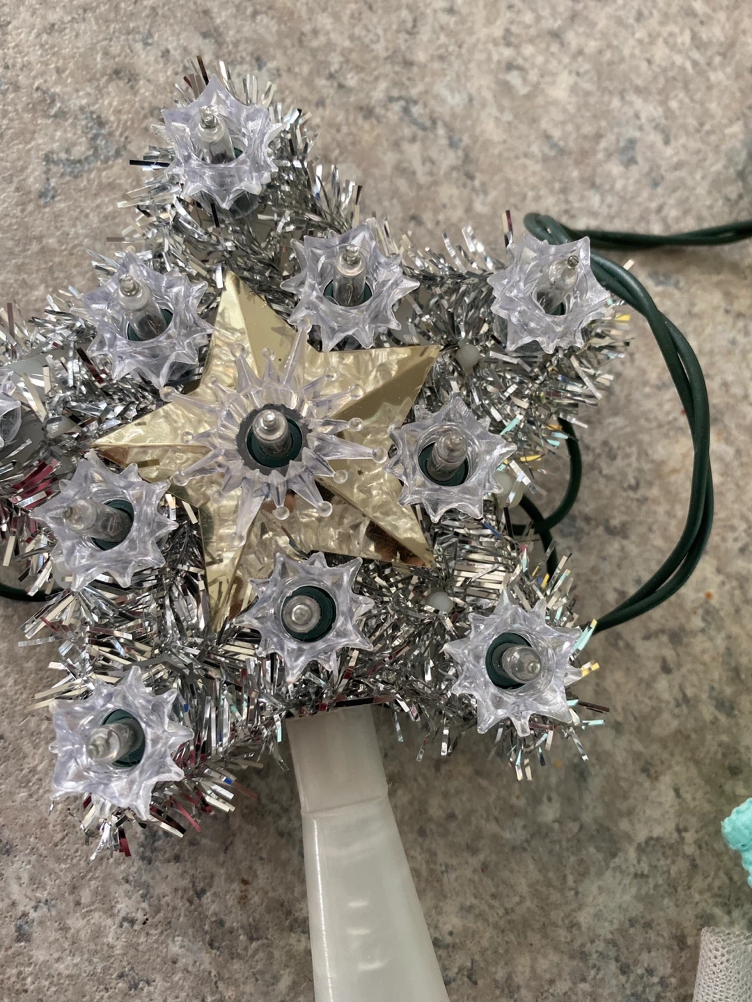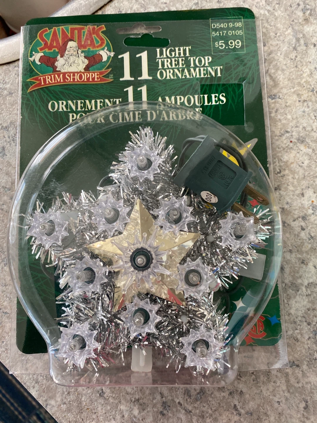 Add a touch of sparkle to your Christmas tree 11-light tree top ornament! This star-shaped ornament features a silver tinsel design and clear lights, perfect for creating a festive atmosphere. Moving Sale Pick up only