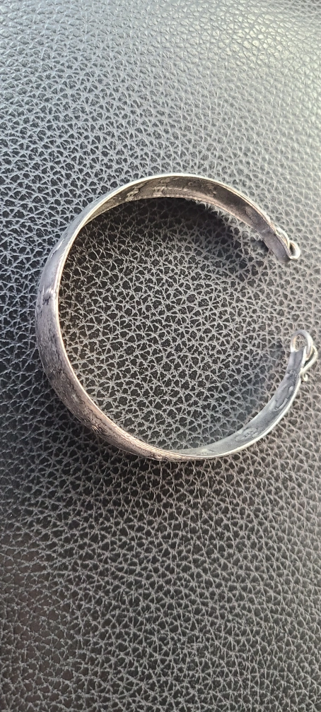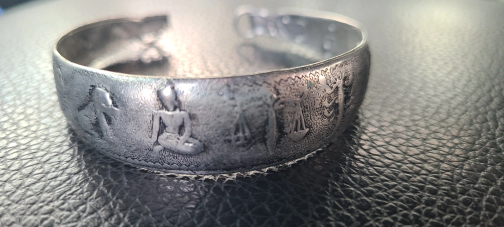 Selling a unique silver tone cuff bracelet. It features various engravings around the band. clasp is missing a piece. It has some signs of wear, but it's still a beautiful piece to add to your collection
