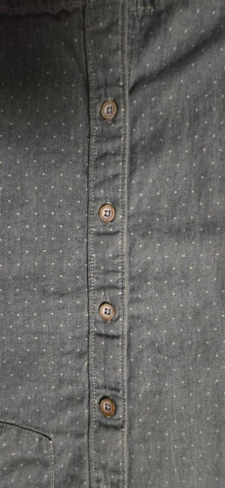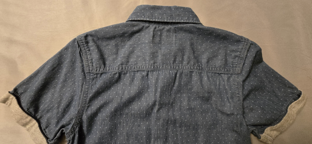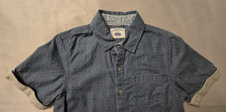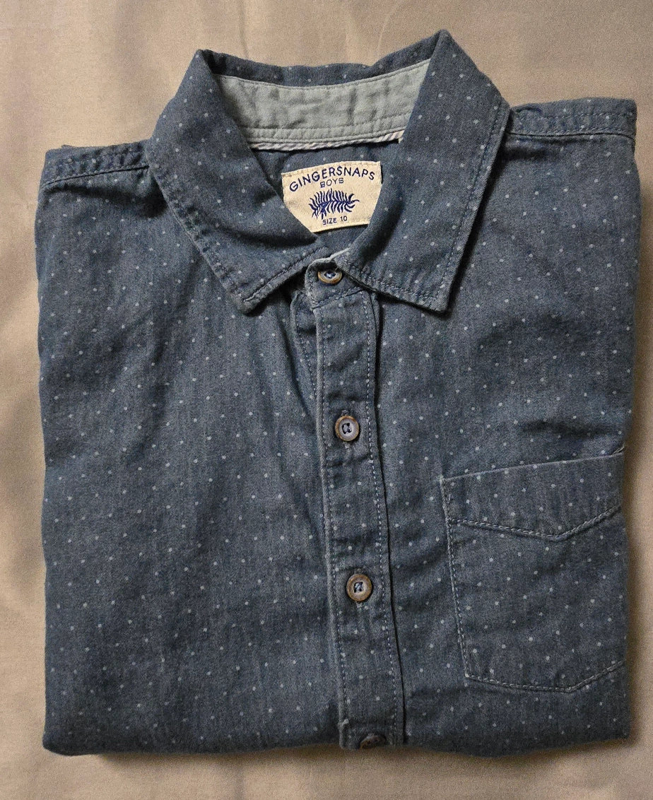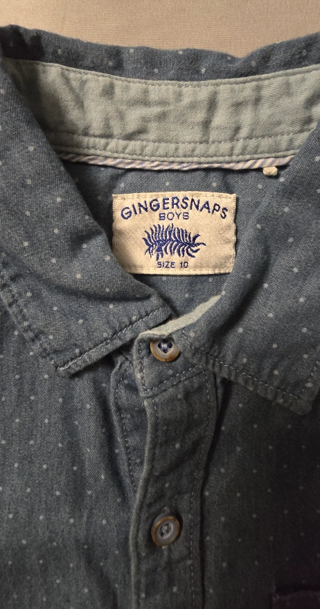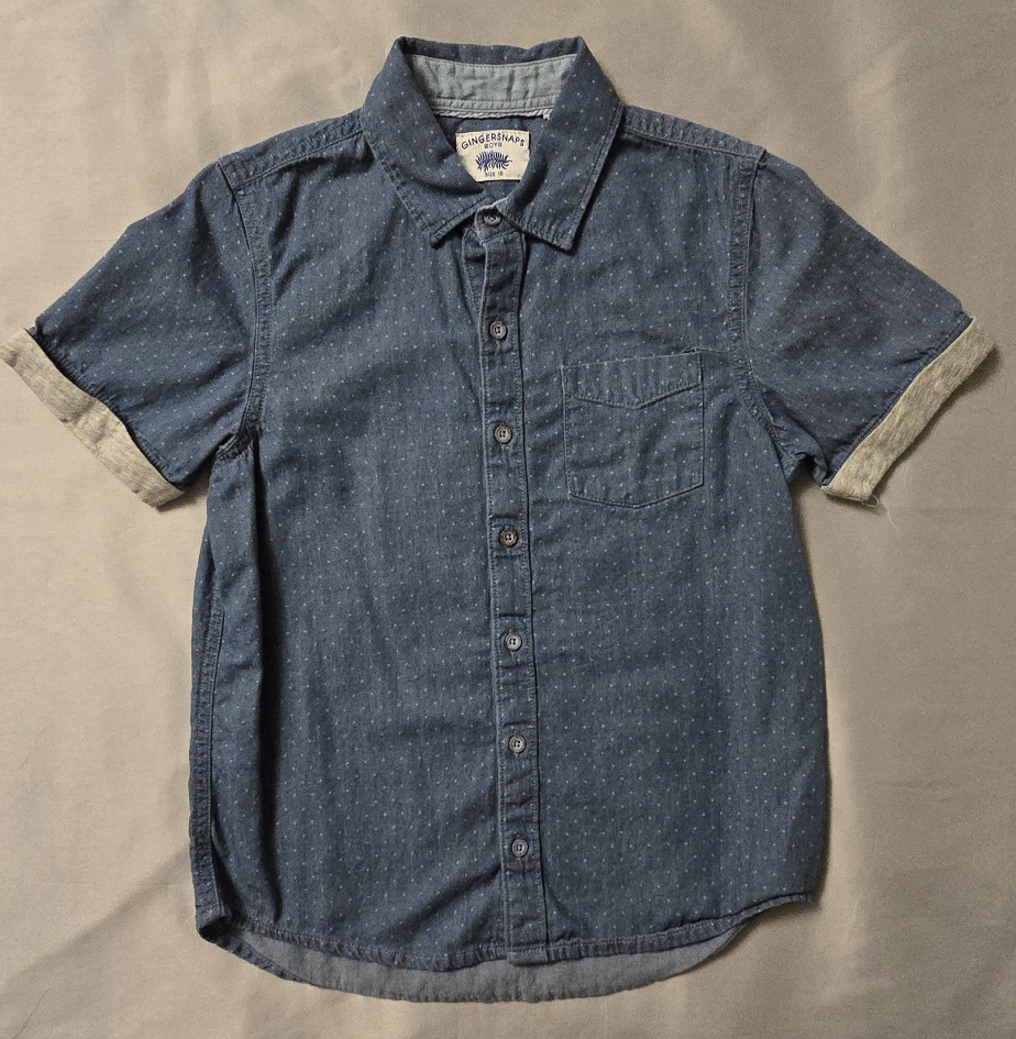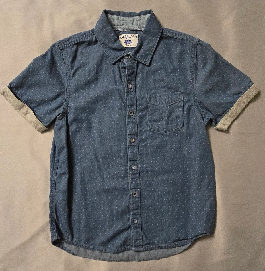 A cute Gingersnaps boys shirt. Fits like a buy 6! It's short-sleeved, button-up style with a denim-like appearance and a subtle dotted pattern. Perfect for casual wear!