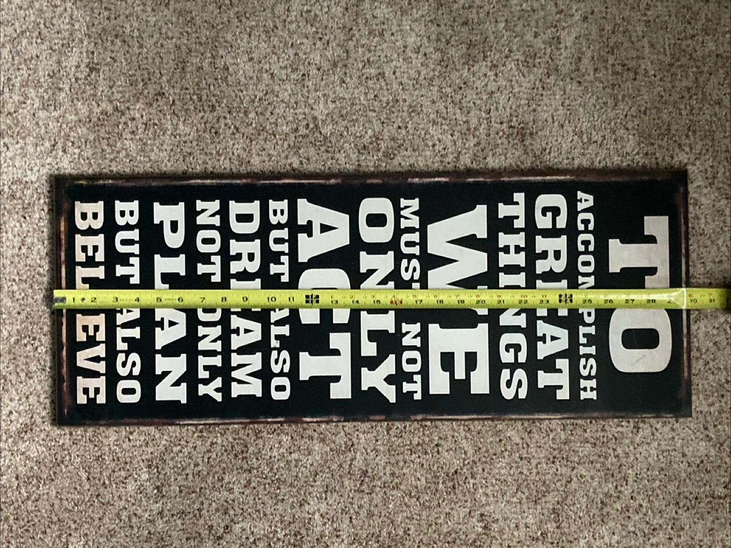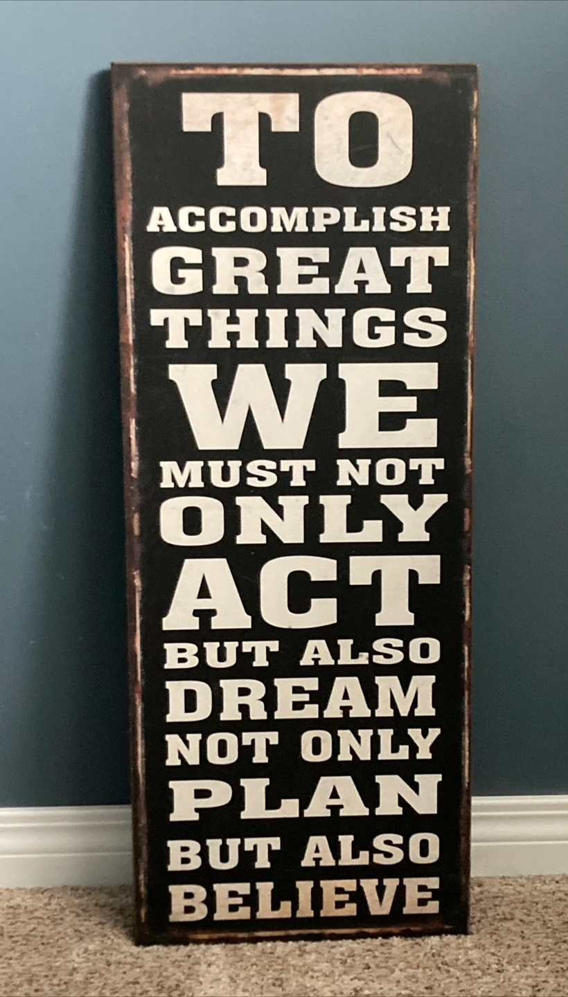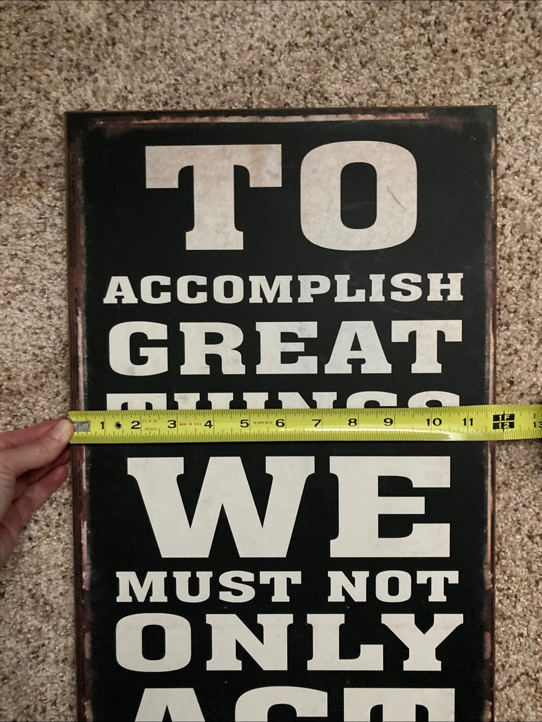 Add some inspiration to your space with this wall decor sign! It reads "To accomplish great things we must not only act but also dream not only plan but also believe".