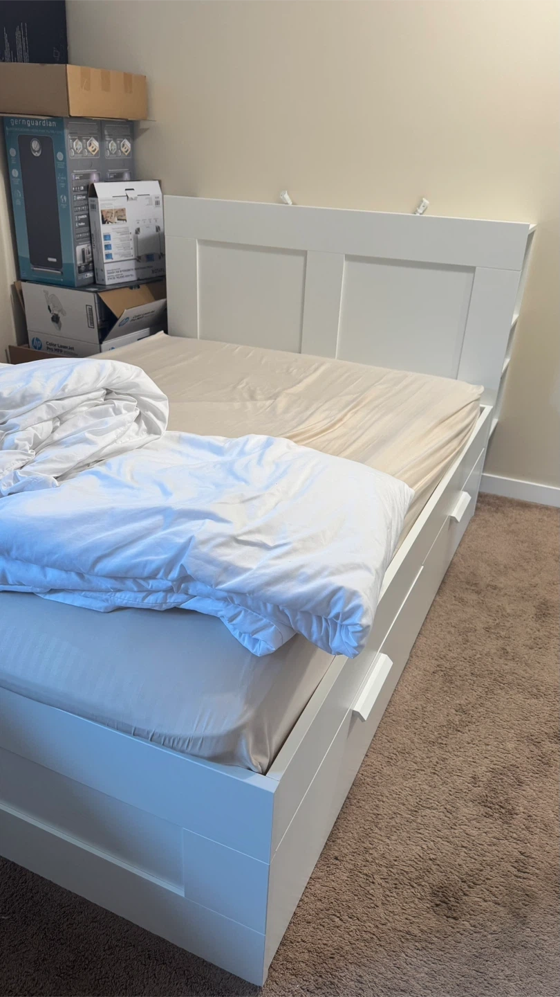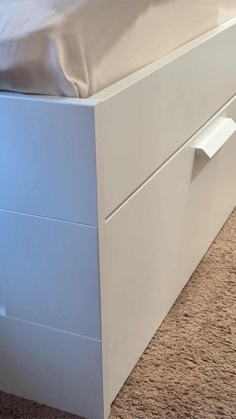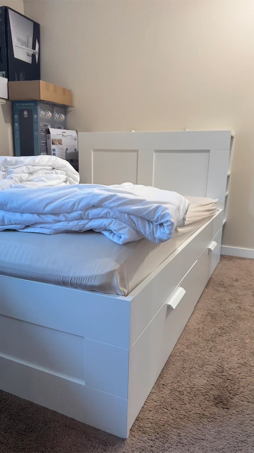 Selling a white IKEA bed frame that comes with built-in storage! It's in great shape and ready for a new home. The bed frame features handy drawers underneath for storing extra linens, clothes, or anything else you need to keep tidy. It's a practical and stylish addition to any bedroom. Bought for 520$