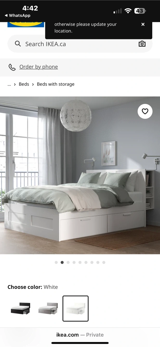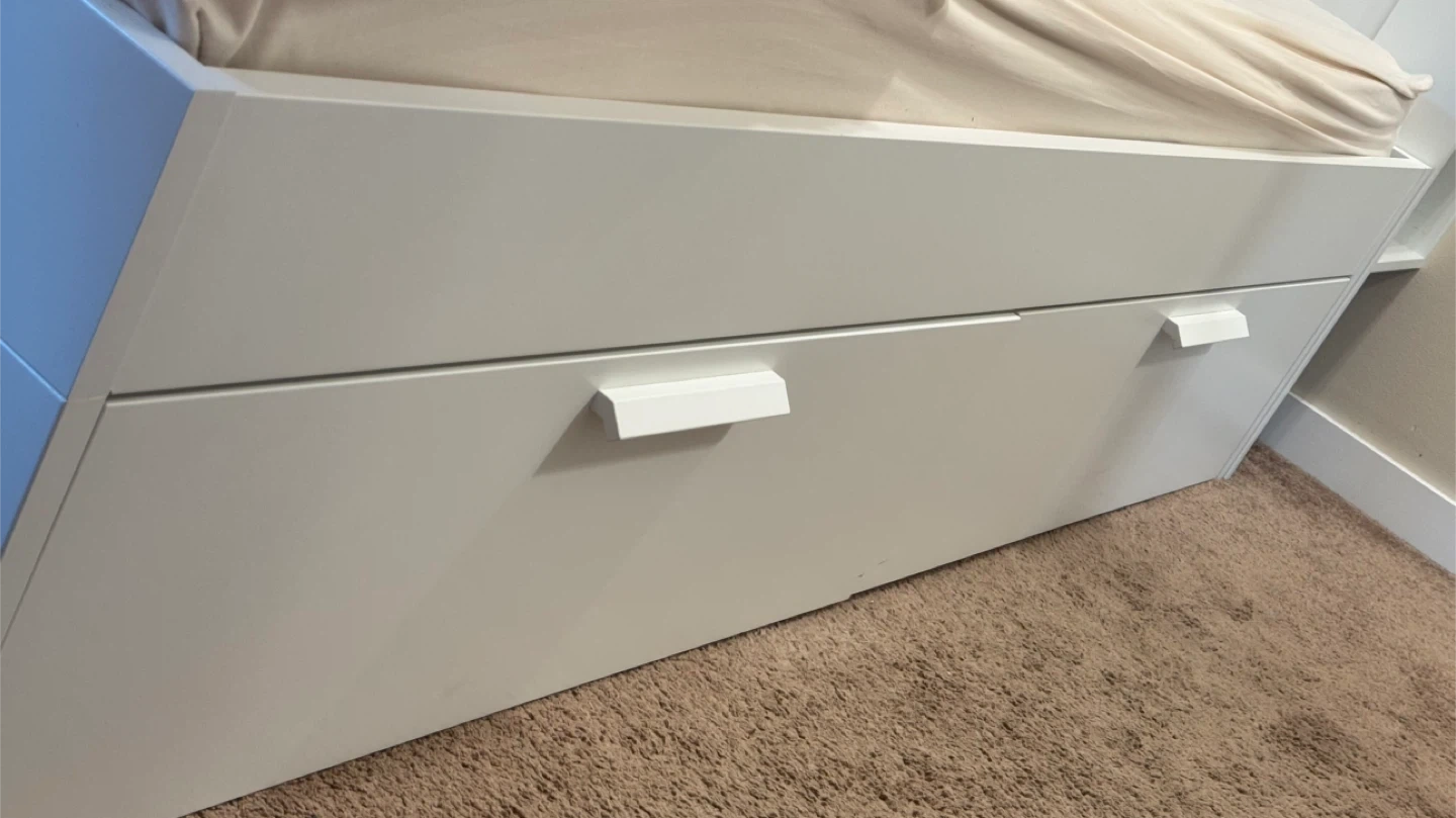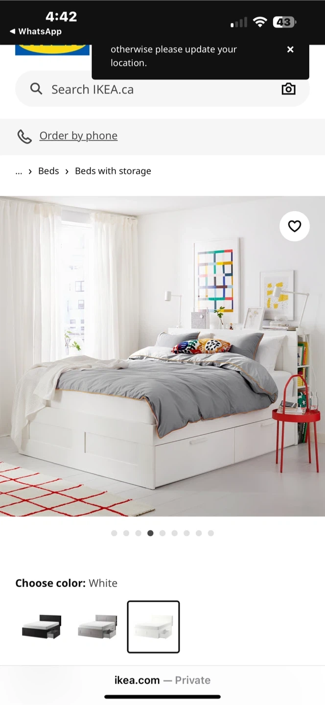 Selling a white IKEA bed frame that comes with built-in storage! It's in great shape and ready for a new home. The bed frame features handy drawers underneath for storing extra linens, clothes, or anything else you need to keep tidy. It's a practical and stylish addition to any bedroom. Bought for 520$