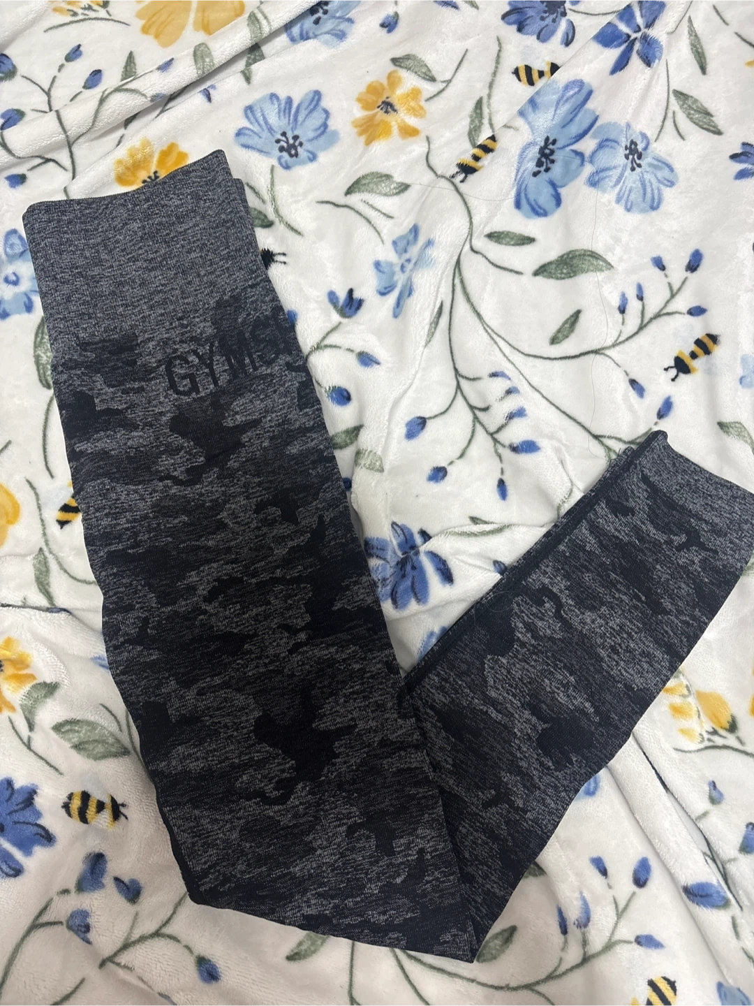 Gymshark camo seamless leggings. High-waisted design with a flattering fit. Fabric is a stretchy blend, perfect for workouts. Designed for comfort and performance. Pick up cash only