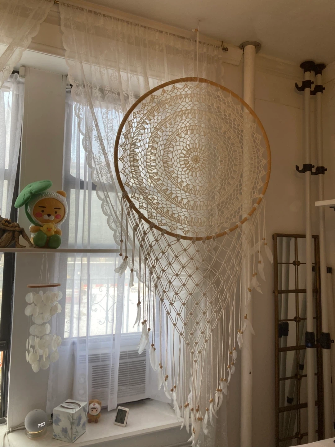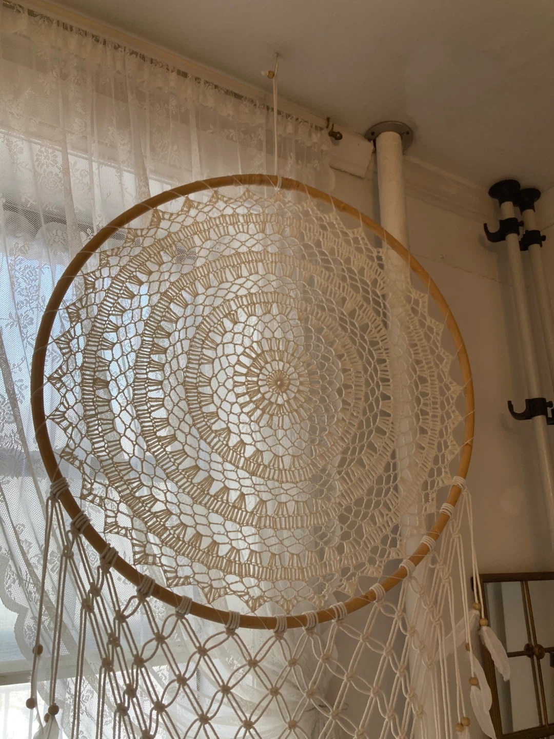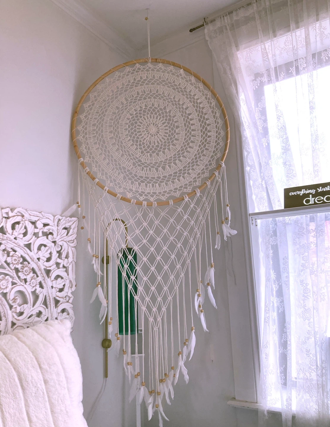 Pickup and cash only. This is a large boho macrame dream catcher with intricate crocheted detailing. It features a wooden hoop and hanging strings adorned with feathers and beads. Perfect for adding a touch of bohemian style to any room! W 30 H 76