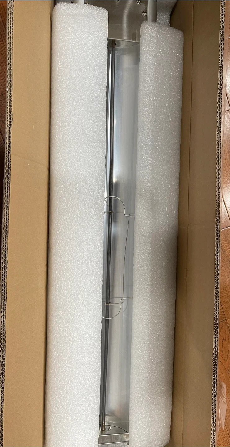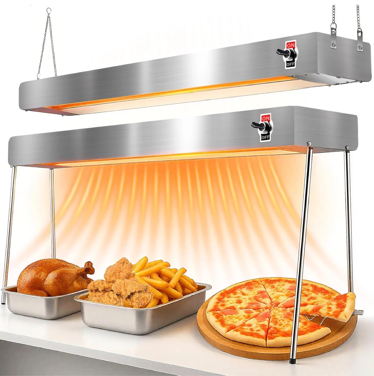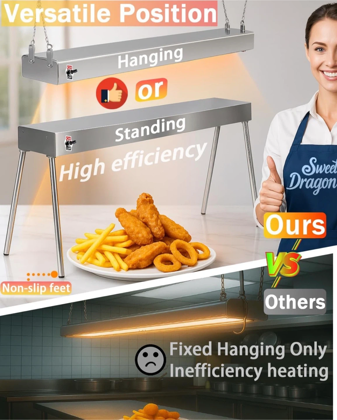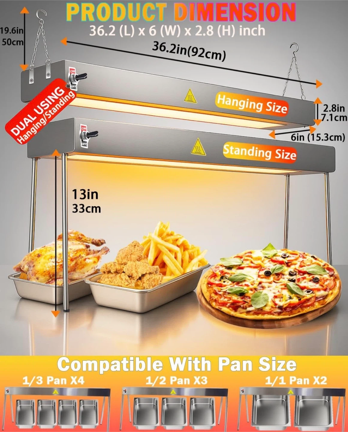Keep your food warm with this PYY commercial heat lamp. It's versatile, offering both hanging and standing options. Stainless steel construction ensures durability. It's 36.2 inches long and 6 inches wide when standing.