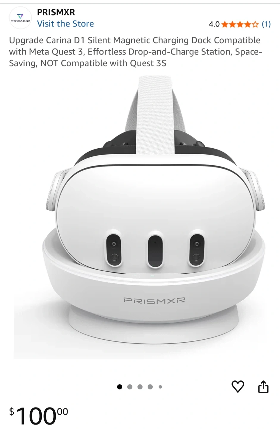 This is the PRISMXR Carina D1 charging dock for your Meta Quest 3 headset. It's designed for easy drop-in charging and a neat storage solution. Simply place your headset on the dock for a naturally nestled charge.