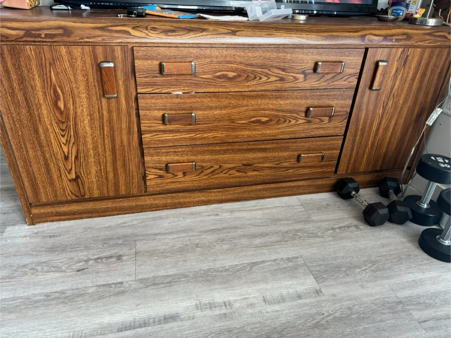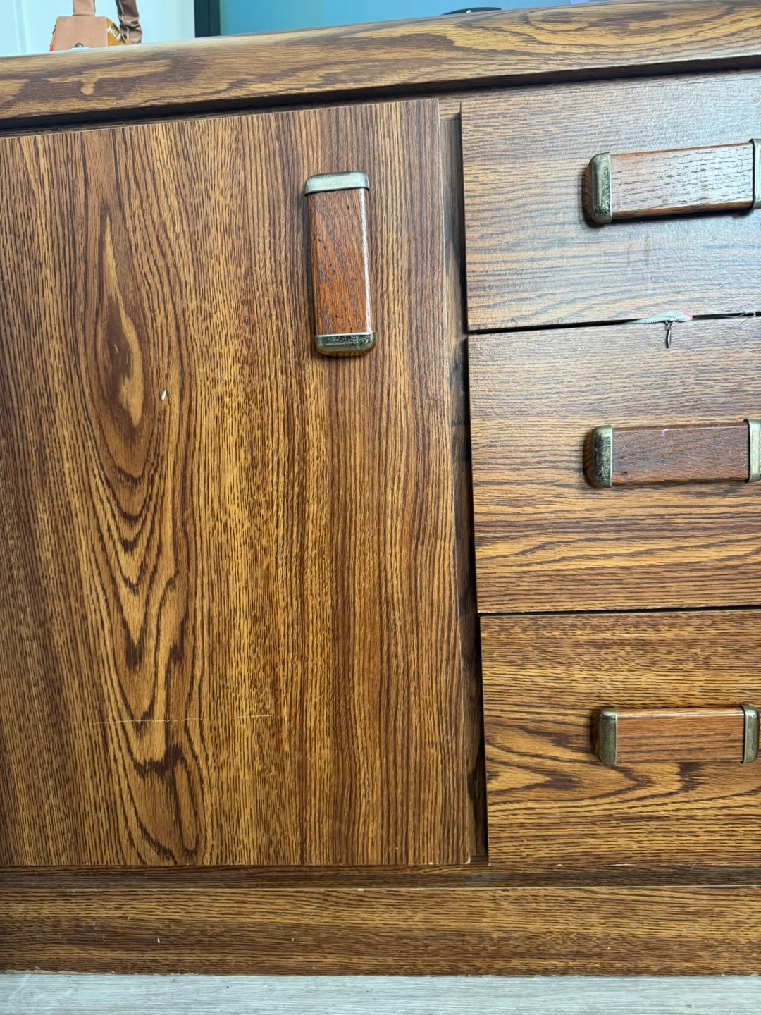 A vintage sideboard cabinet with wood grain detailing. It has three drawers and two cabinet doors for ample storage. The handles are a mix of wood and brass tones.
