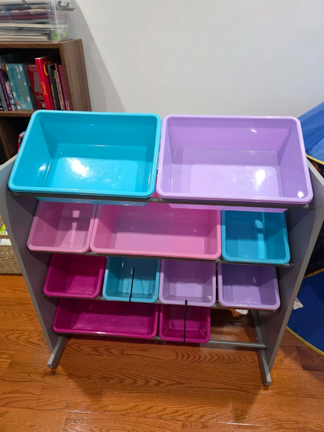 This toy organizer has a gray frame with multiple colorful bins. It features two large top bins in teal and lavender, with smaller pink, teal, and lavender bins below. This storage shelf is great for keeping toys tidy and accessible for children.