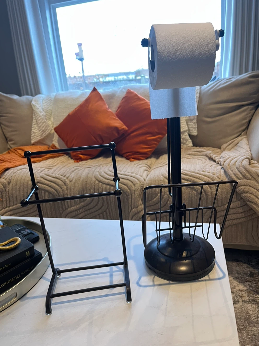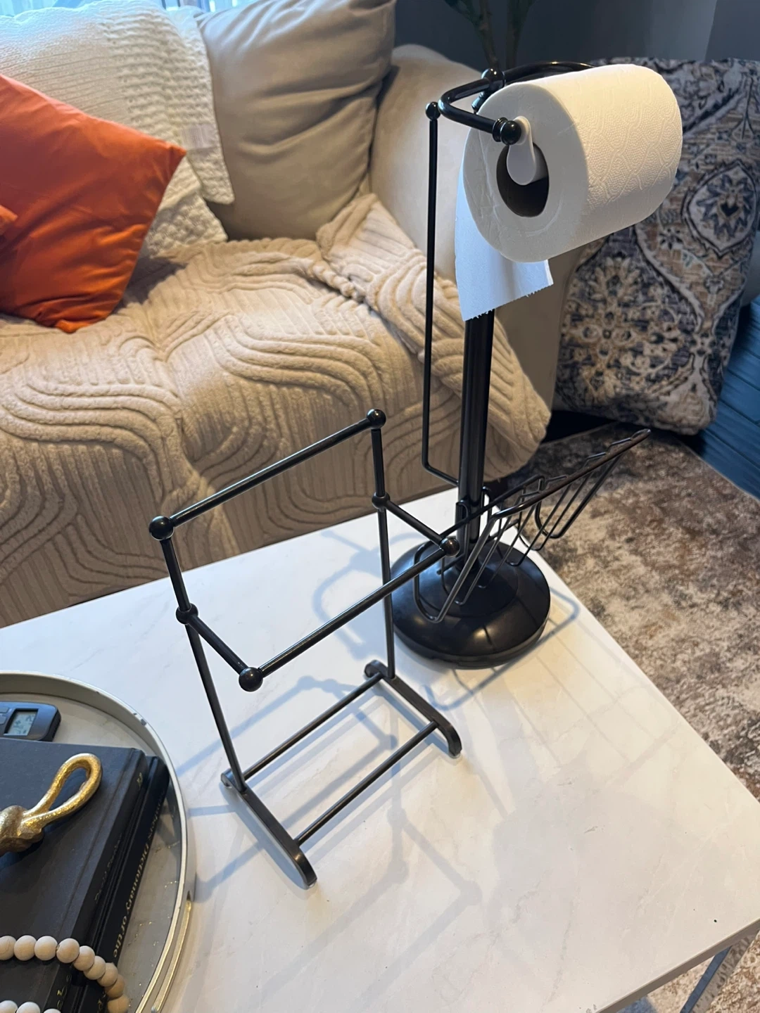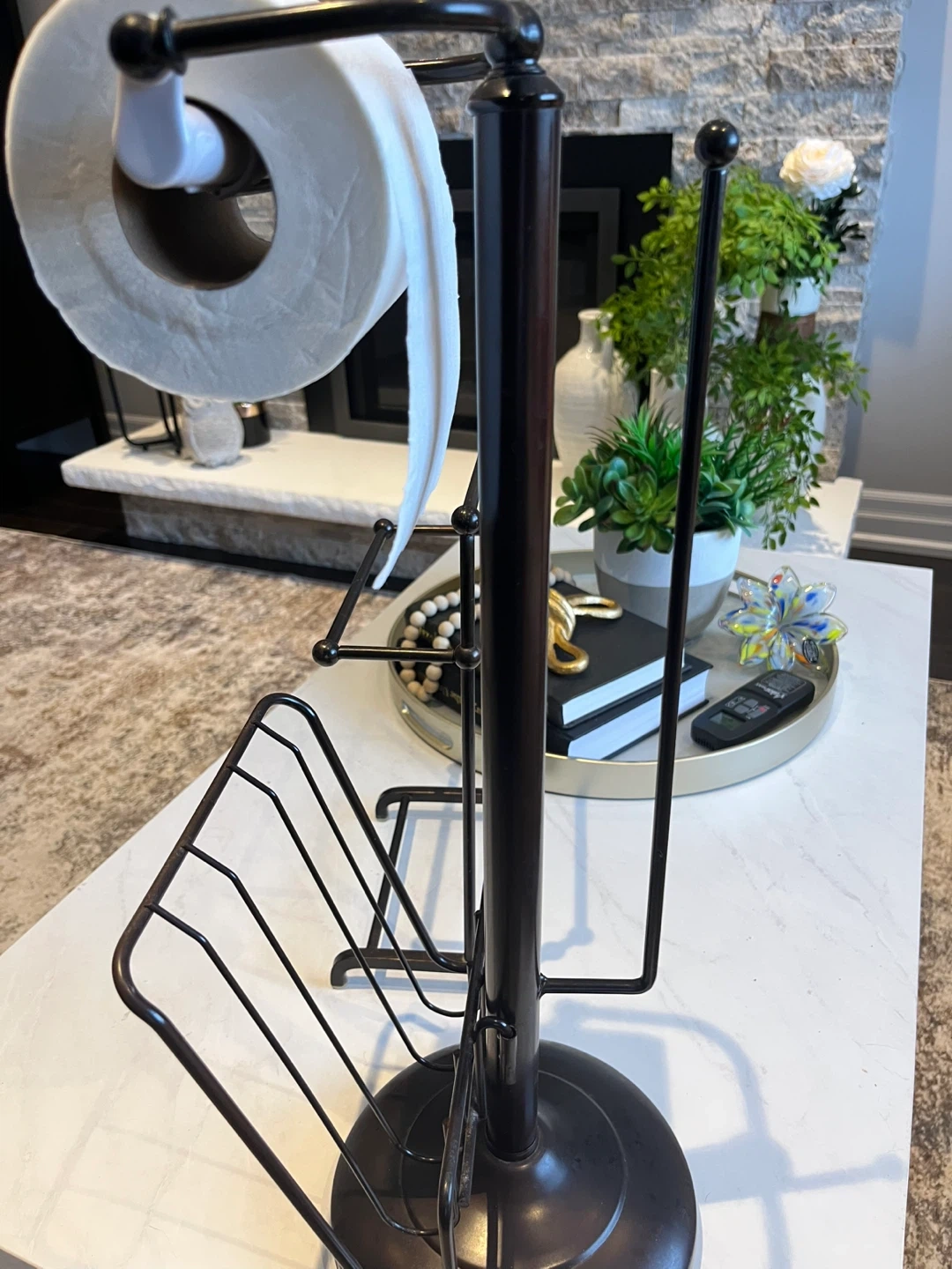This floor-standing toilet paper holder comes with a built-in magazine rack. It's made of durable black metal. It also includes a small rack for an extra toilet paper roll.