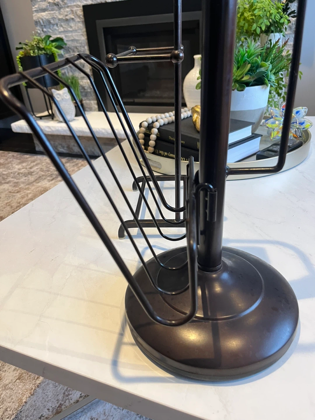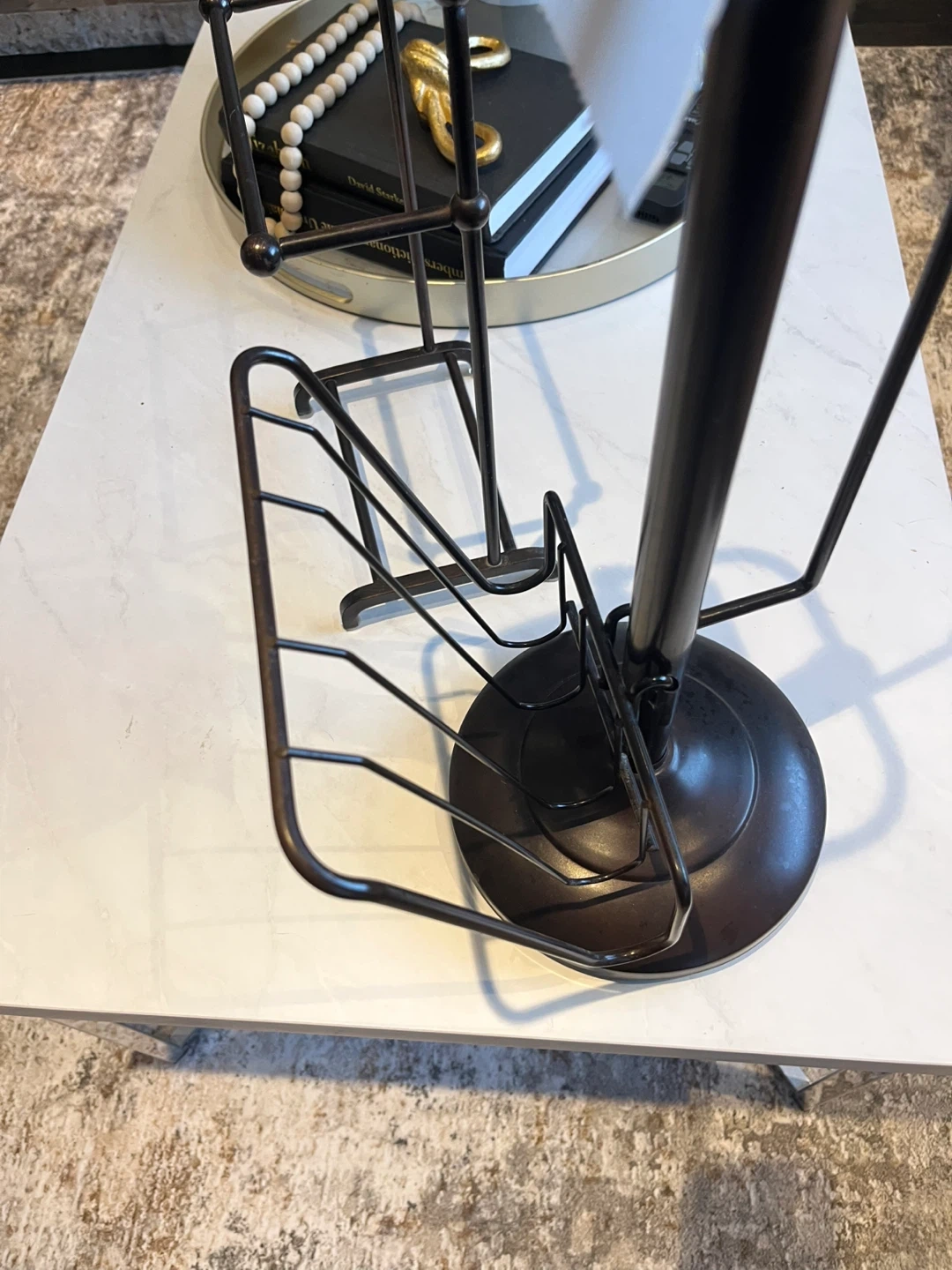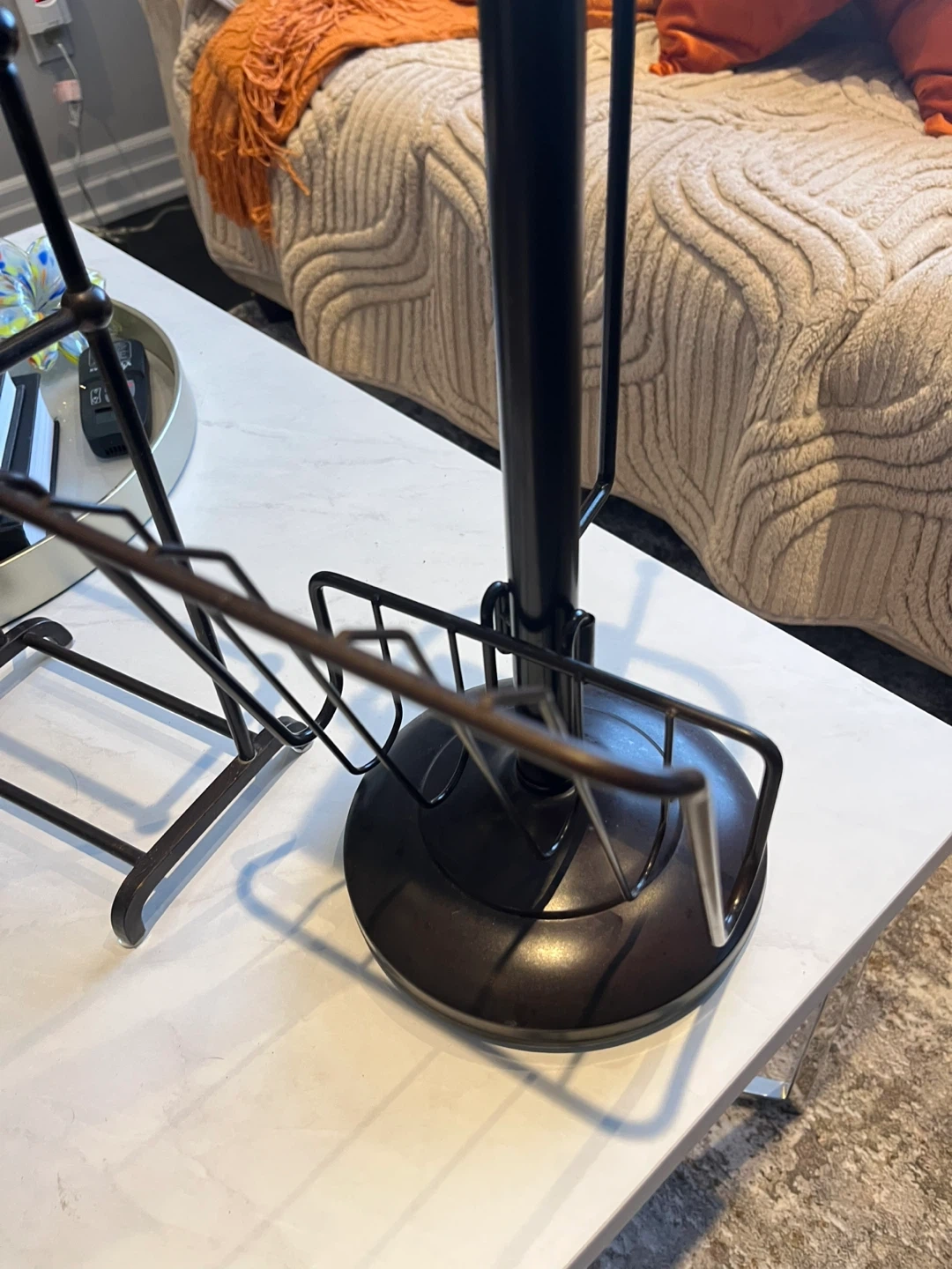 This floor-standing toilet paper holder comes with a built-in magazine rack. It's made of durable black metal. It also includes a small rack for an extra toilet paper roll.
