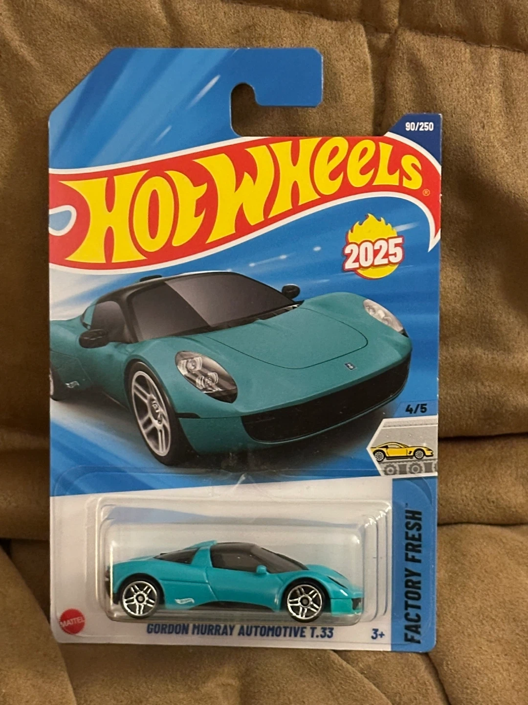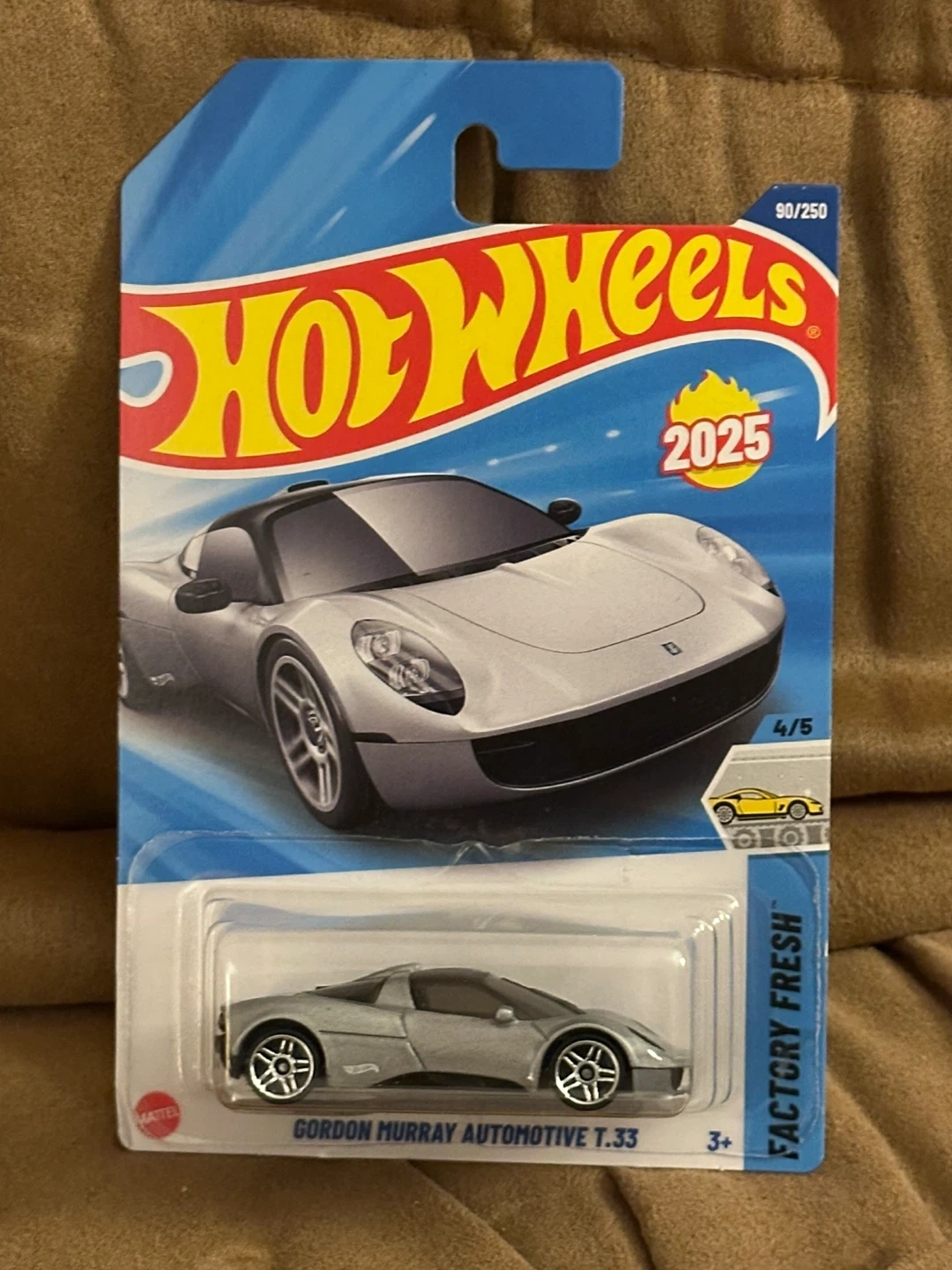 A new Hot Wheels die-cast car featuring the Gordon Murray Automotive T.33. It's part of the 2025 collection, carded and ready to go! This miniature car is a great addition for collectors or for playtime fun.