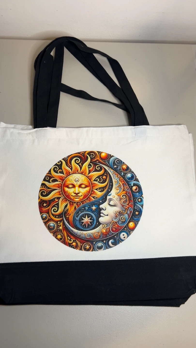 This canvas tote bag features a vibrant sun and moon celestial design. It has black handles and a black bottom panel. The bag's material is canvas.