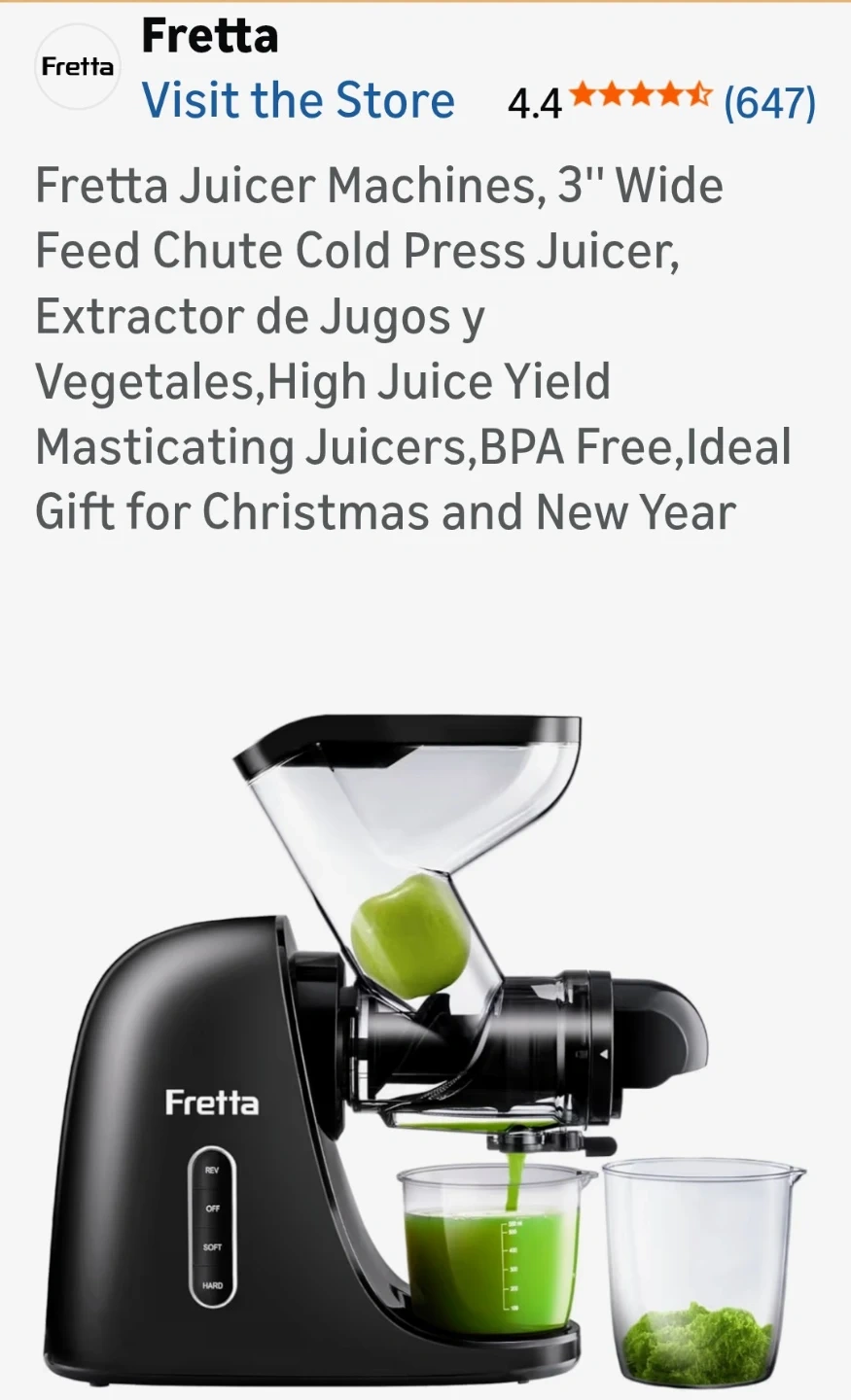 Selling a Fretta Juicer Machine in black! It features a 3" wide feed chute, so you can fit whole fruits. It's a cold press juicer designed for high juice yield and is BPA free. The juicer is made with Tritan material. It measures 15.75 inches tall and 13.78 inches wide.
