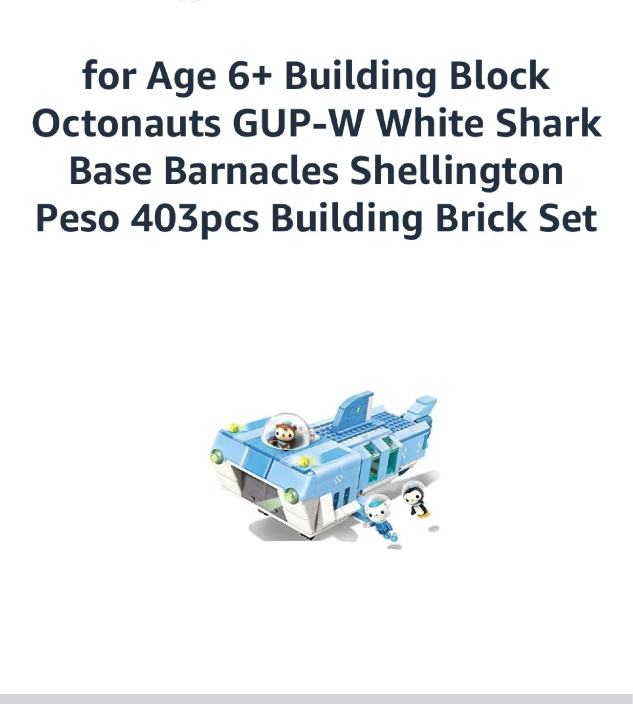 This building brick set includes the Octonauts GUP-W White Shark Base. It's suitable for ages 6+ and contains 403 pieces. Comes with Barnacles, Shellington, and Peso figures.
