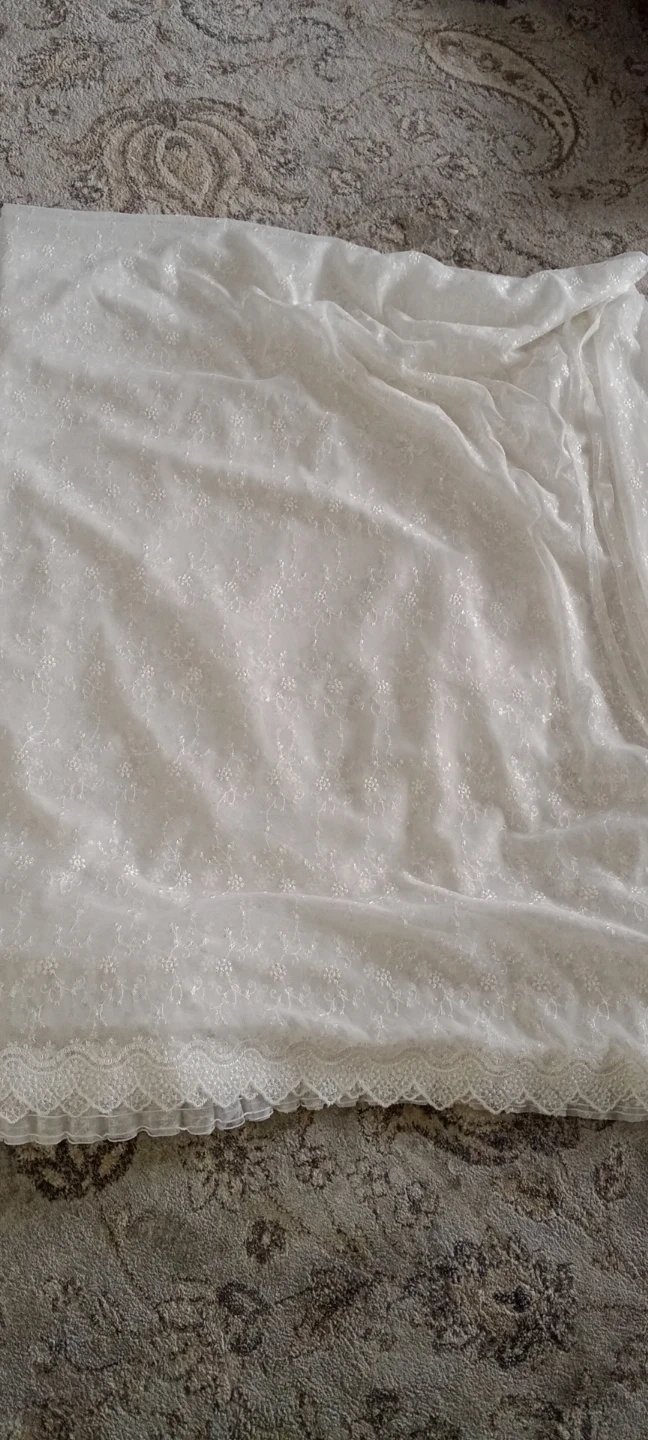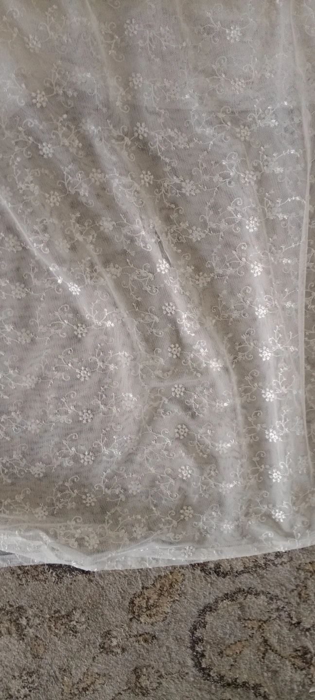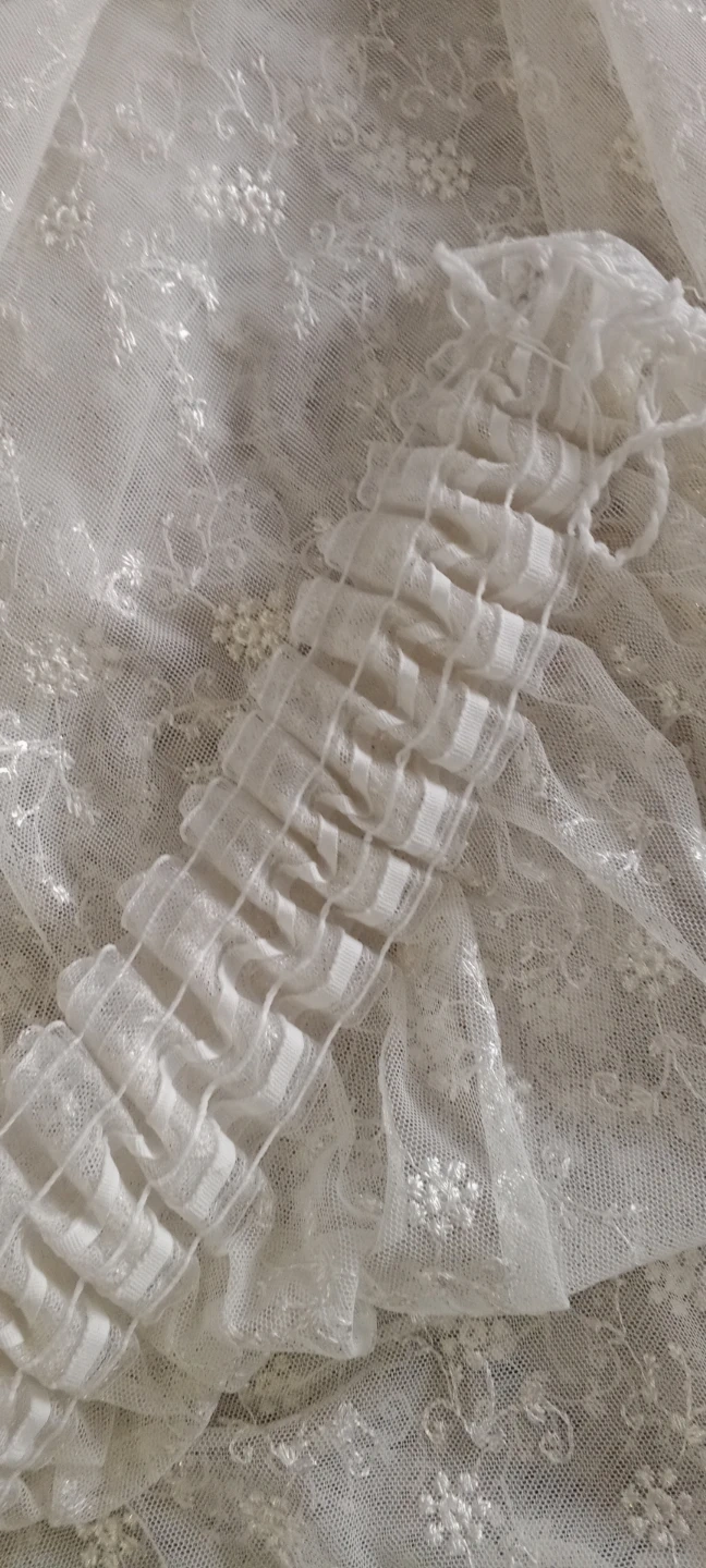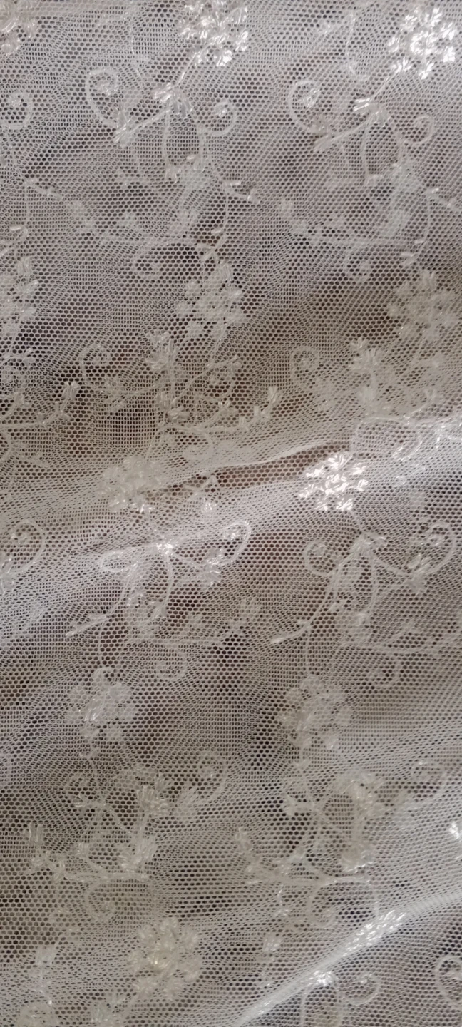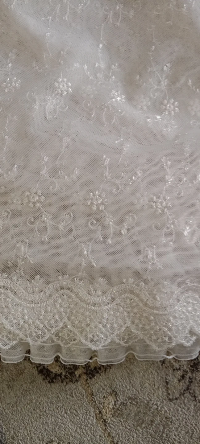 White sheer fabric with delicate floral embroidery. Features a lace trim along the bottom edge. Ruffled elastic band along one side. Great for crafting or dressmaking projects!