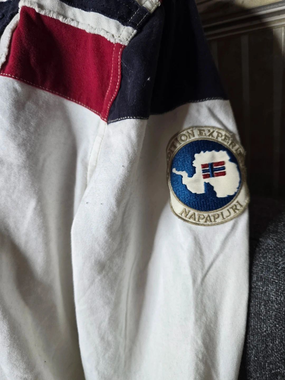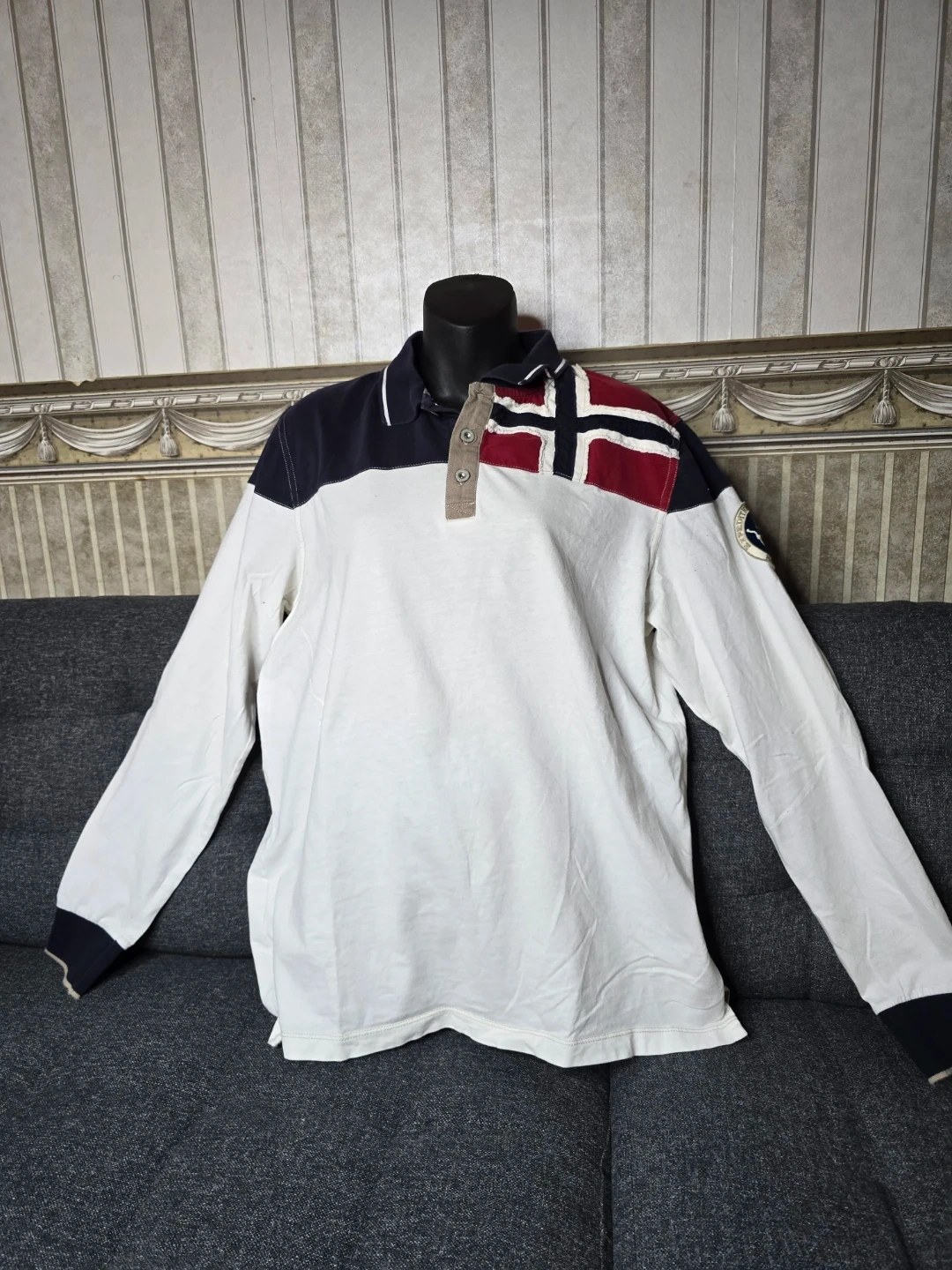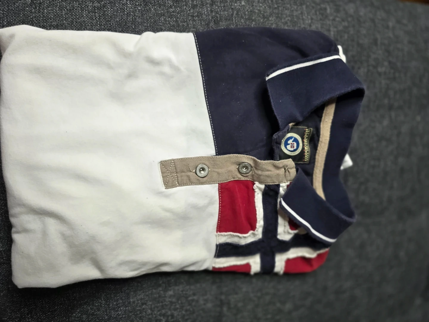 This is a Napapijri long-sleeve rugby shirt. It features a multi-panel design with red, white, and navy blue sections, including a Norway flag motif on the shoulders. Cotton material.