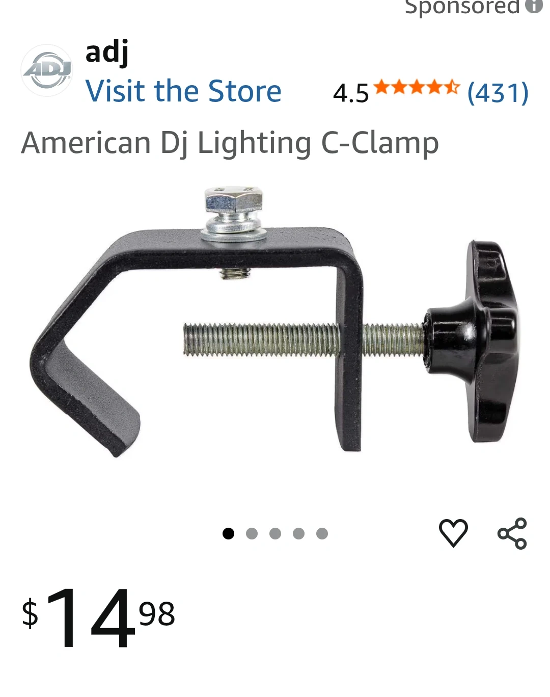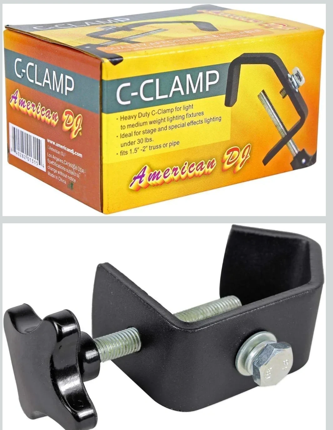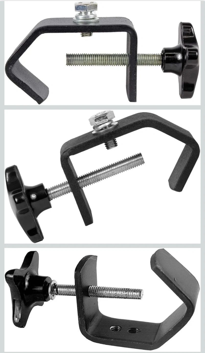 I'm offering American DJ heavy duty C-clamps, designed for mounting light to medium weight lighting fixtures on 1.5" to 2" truss or pipe, in like-new condition. These clamps are ideal for stage and special effects lighting setups.