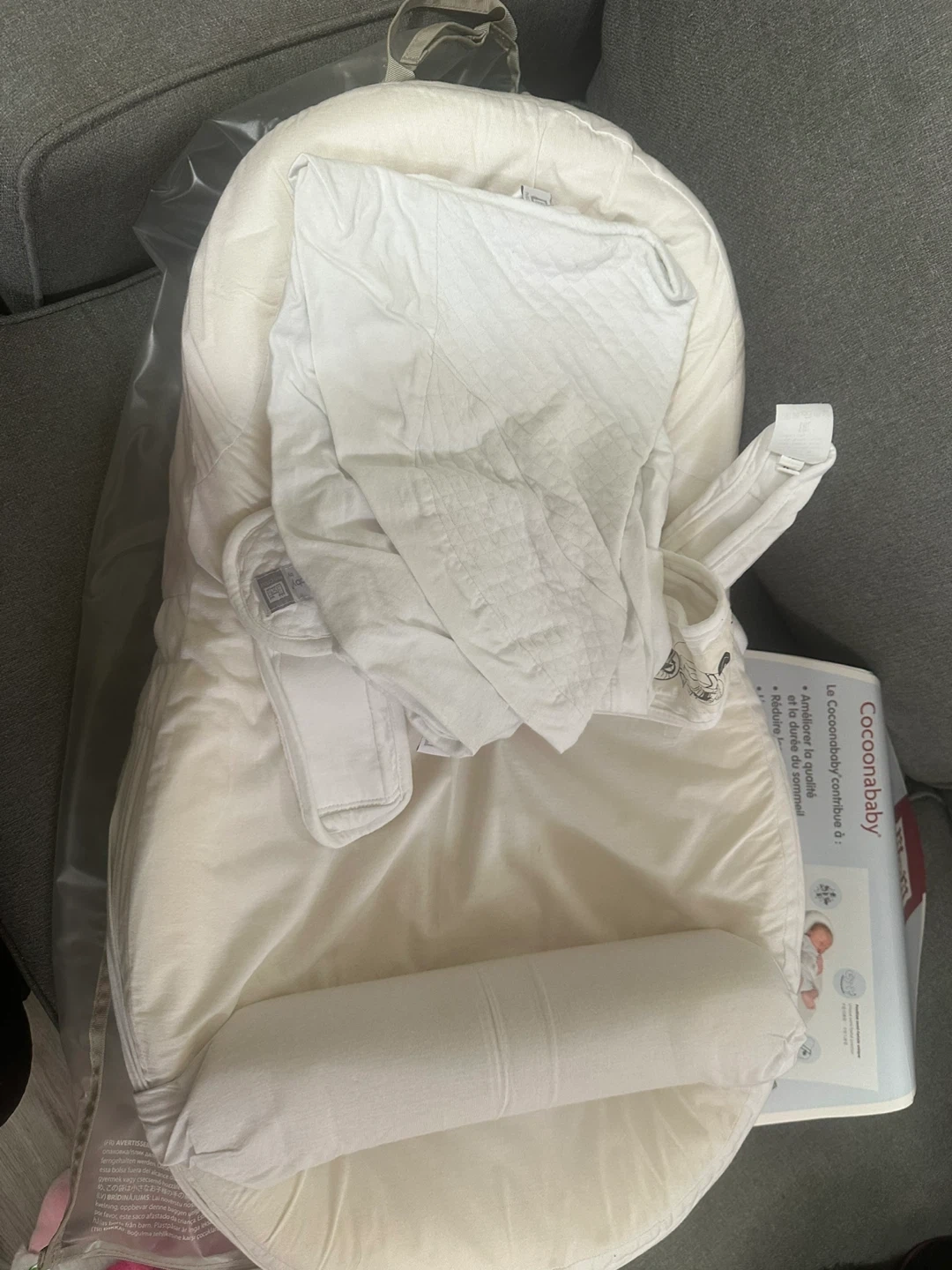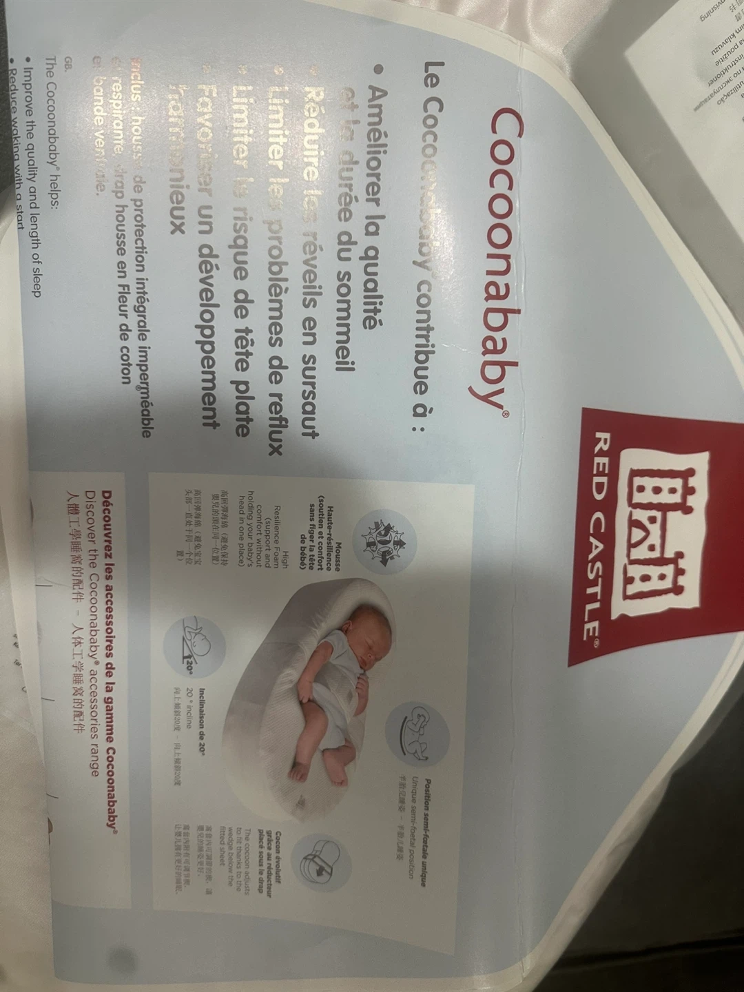 This is a Red Castle Cocoonababy baby nest. It's designed to provide high comfort and support without a fixed posture. Includes a removable cover and positioning bolster. Indication of age 0-20 months.