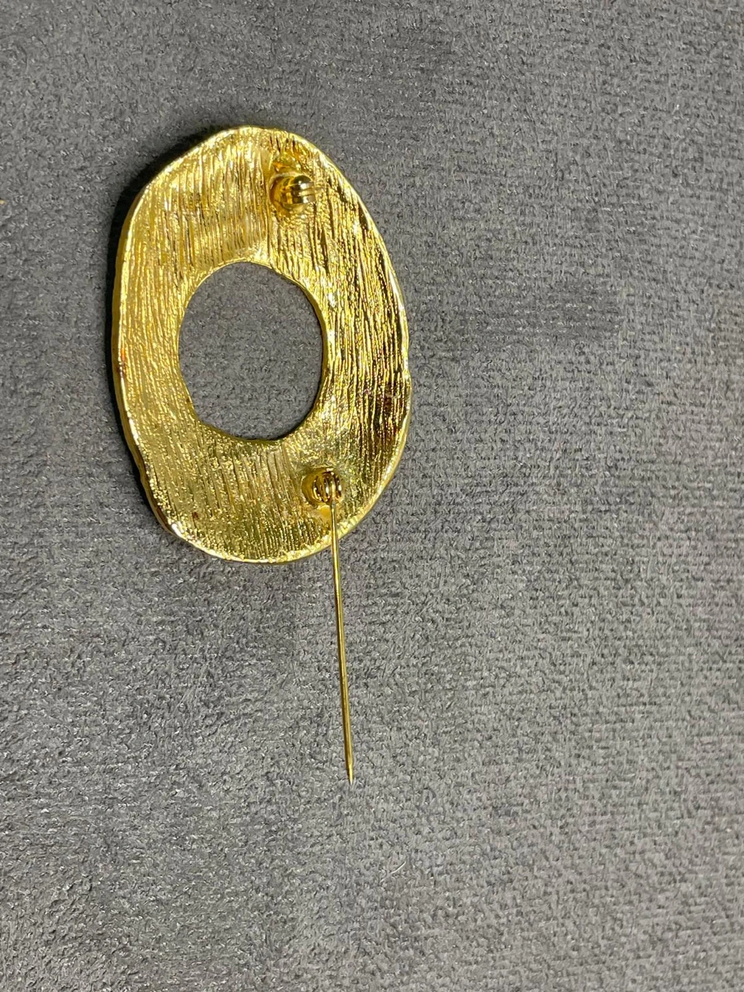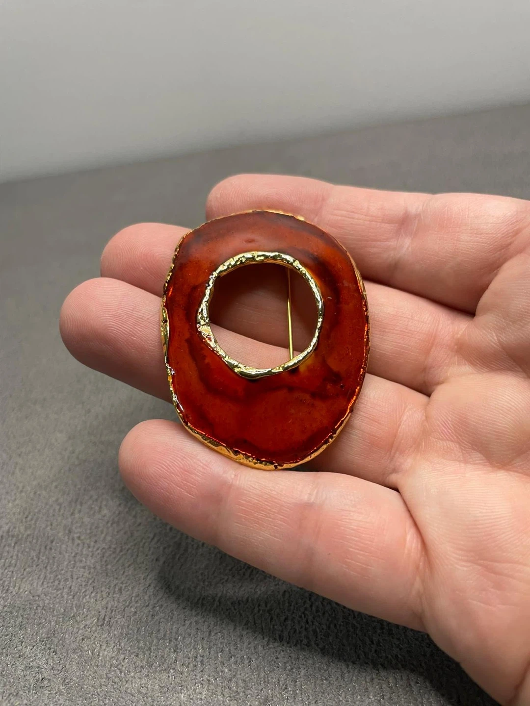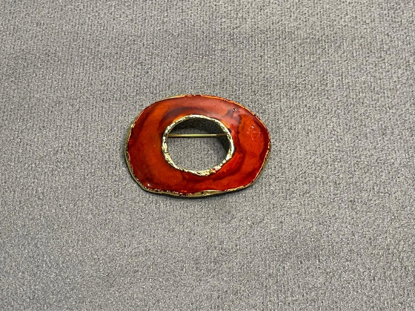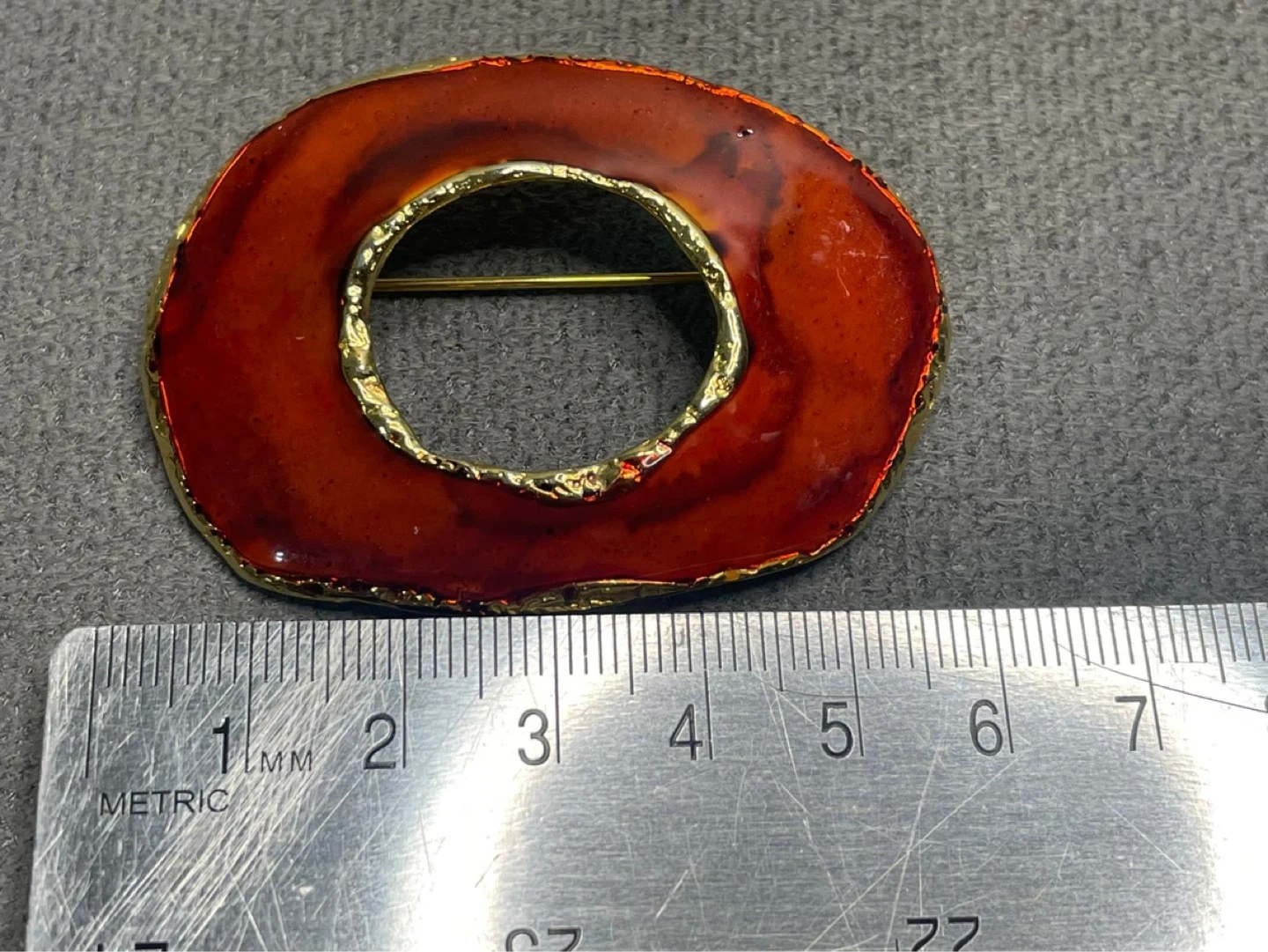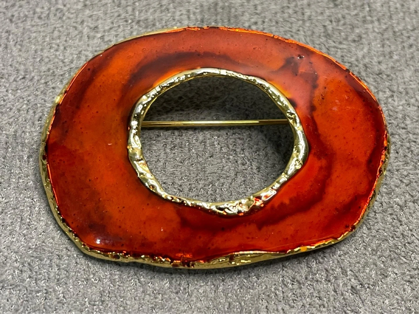This unique brooch has a textured gold-tone metal frame with an orange enamel inlay. It measures approximately 5.5 cm in diameter. The backing features a secure pin closure.