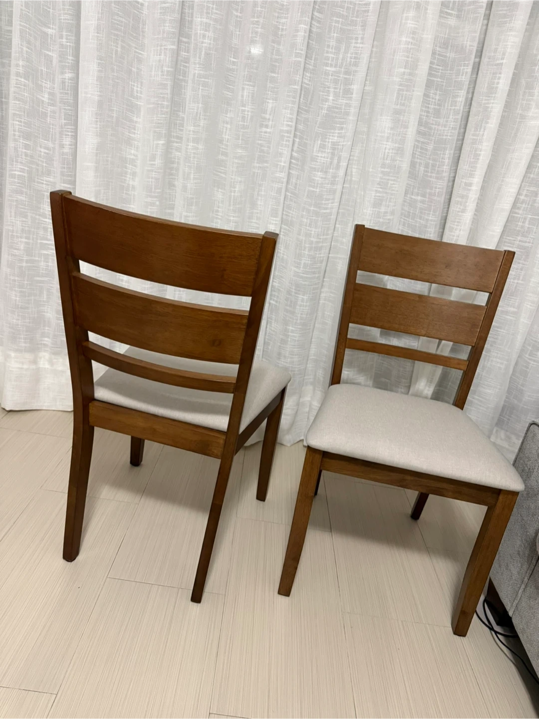 Selling a set of two wooden dining chairs. Each chair has a comfortable upholstered seat in a neutral tone. The wood has a warm, rich finish. They're great for adding extra seating to a dining area!