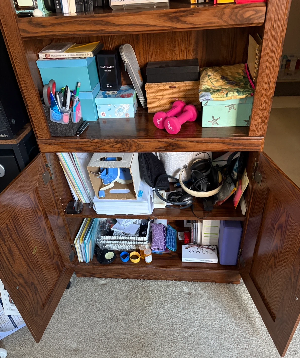 This wooden bookcase features multiple shelves for display and storage. It has a bottom cabinet with doors for hidden storage. Made of durable oak wood.