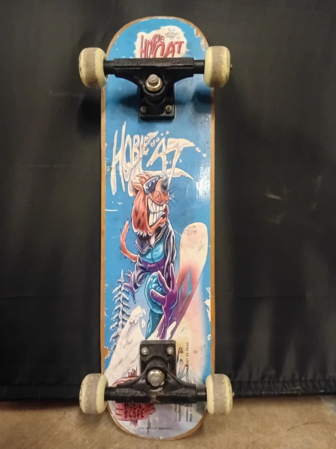 This Hobie Cat skateboard features a cartoon beaver character. It has a wooden deck and standard trucks and wheels. The graphics are vibrant and playful.