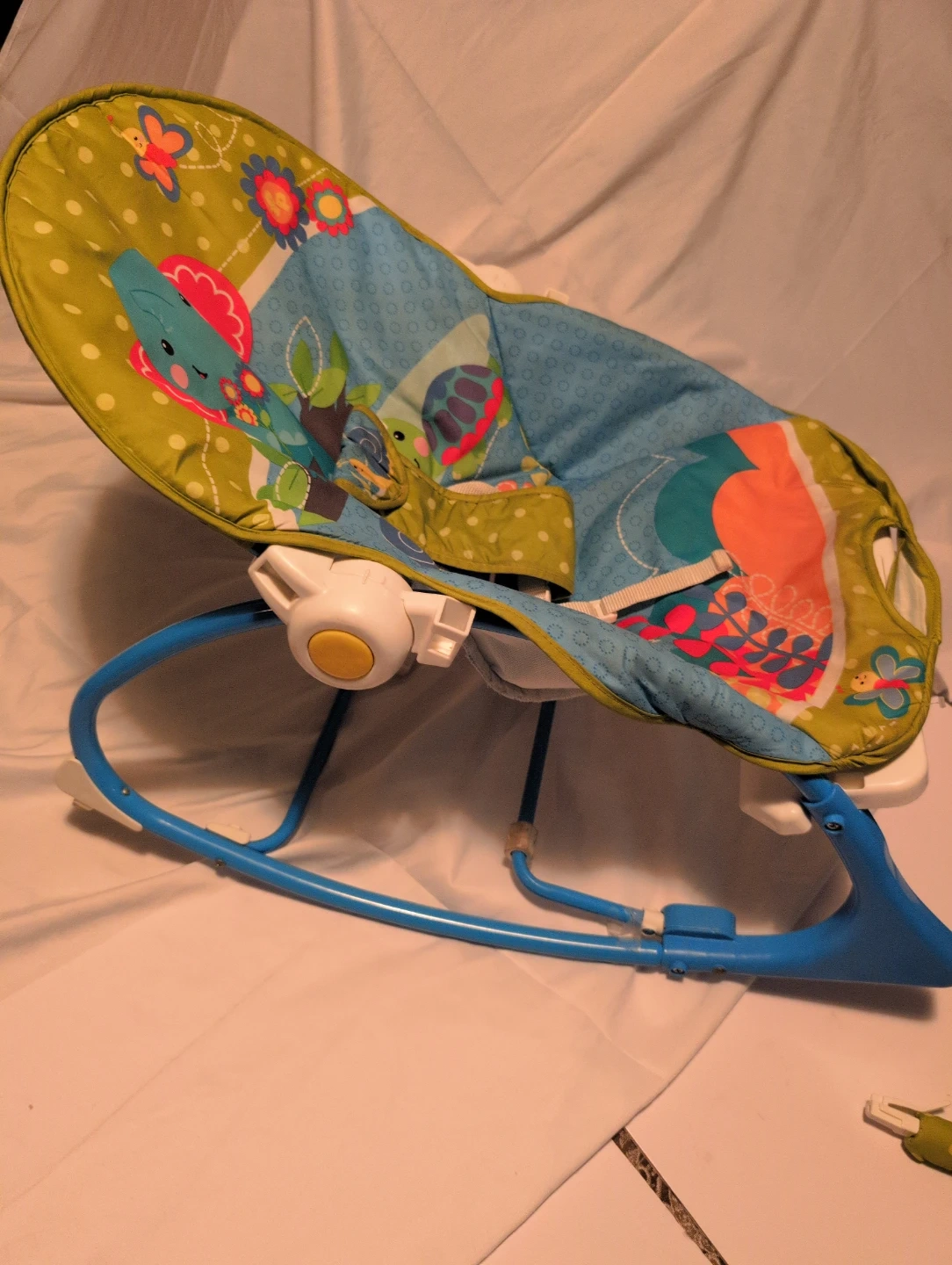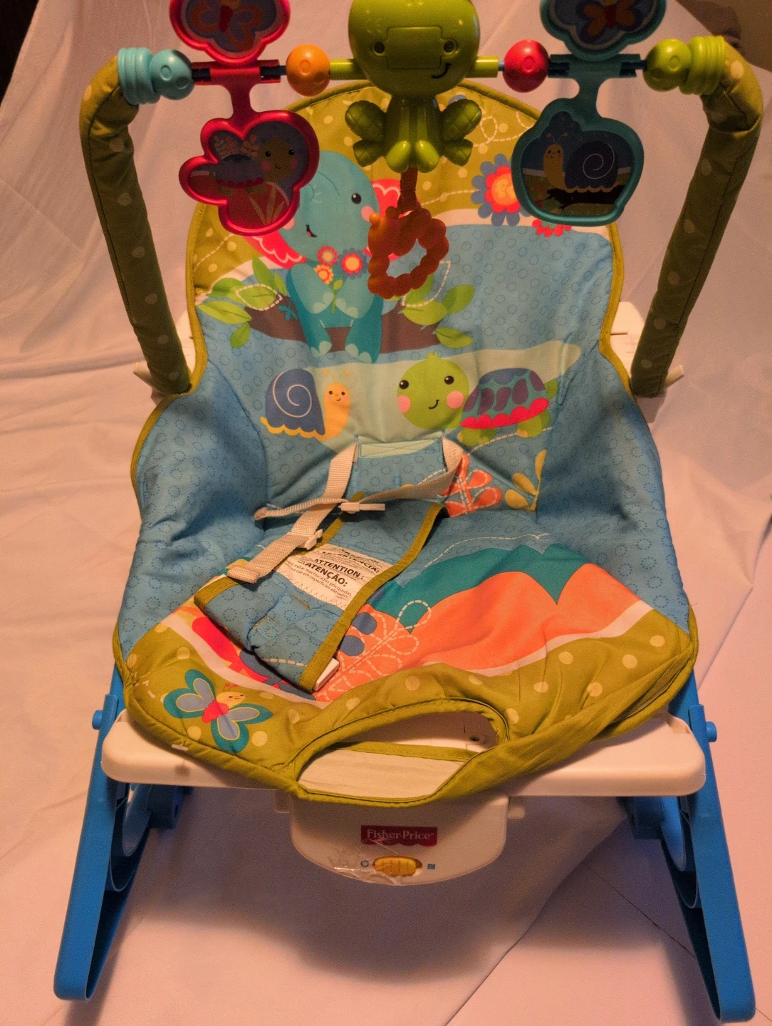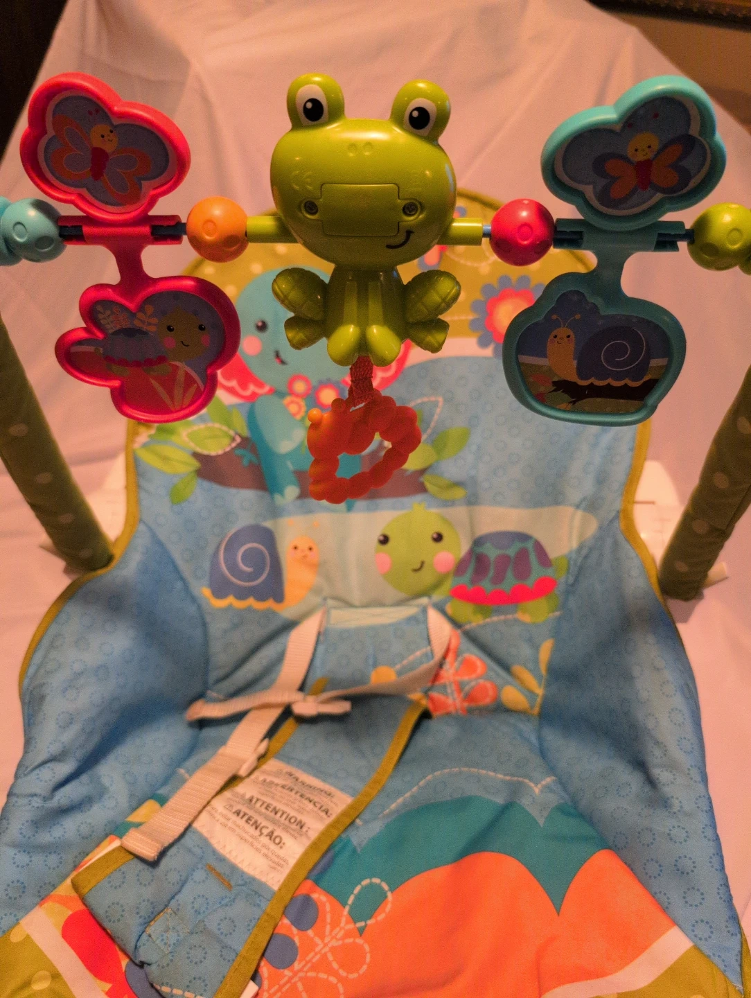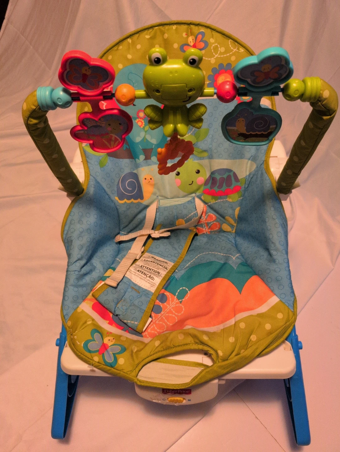 Fisher-Price baby bouncer seat with a colourful, nature-themed print. It comes with a removable toy bar featuring a frog and other hanging toys. The seat has a 3-point harness for safety. This bouncer is suitable for infants.