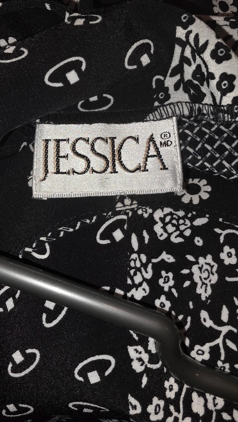 This Jessica spaghetti strap dress features a unique black and white patchwork print. It has a flattering V-neck , criss-cross straps. The asymmetrical hemline adds a stylish flair.