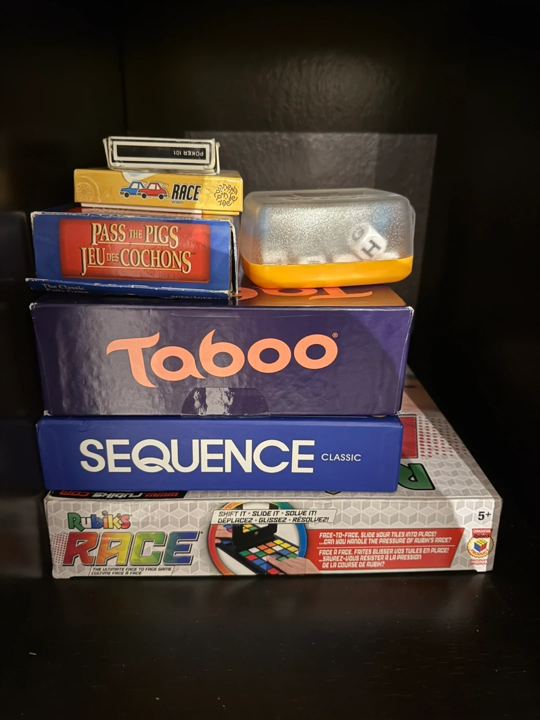 Bundle of five classic board games. Includes Rubik's Race, Sequence, Taboo, Pass the Pigs, and a deck of Poker 101 cards. These games are great for family game nights and social gatherings.