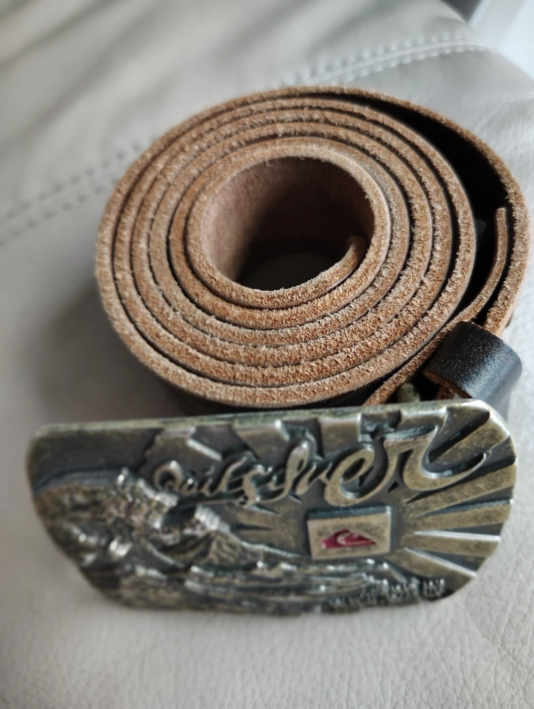 This is a Quiksilver leather belt. It's size 36 and made of leather. The buckle has a cool wave design. Great for adding some style to your outfit!