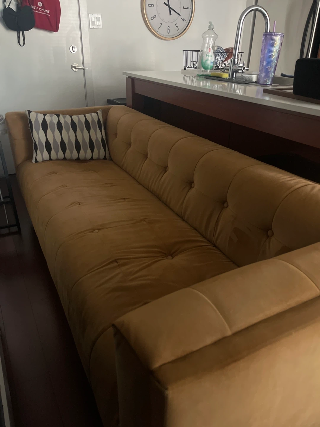 Selling a lovely gold velvet sofa. It's in great shape and would look great in any living space. The tufted design adds a touch of elegance and comfort to your home. It's a stylish and comfortable piece! Only had it for a short time, bought something bigger and need this one gone. Pickup in downtown Vancouver. Preferably cash