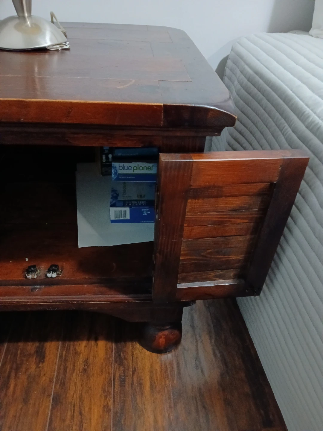 Great quality wooden vintage side or end table. 2 feet by 2 feet. Two little doors open to a pretty large interior storage space. Can store anything here -- video games, movies, books, etc