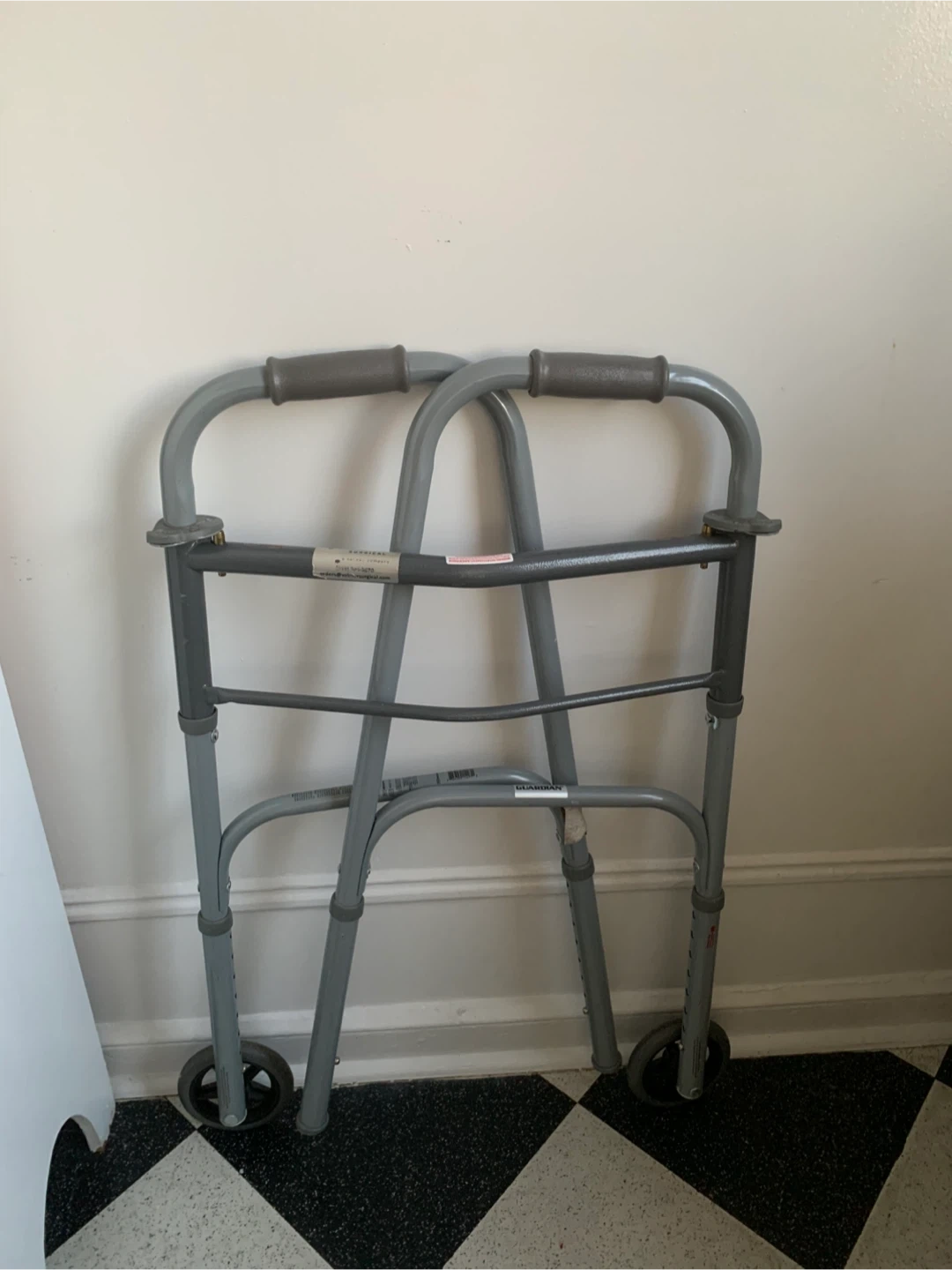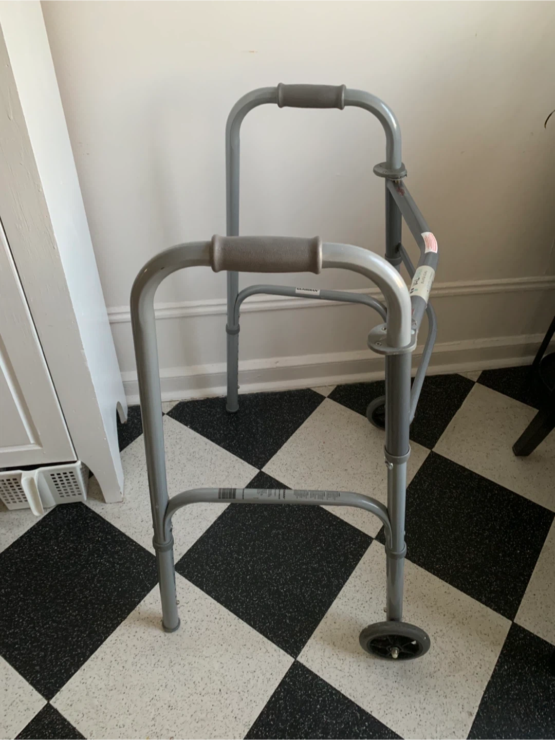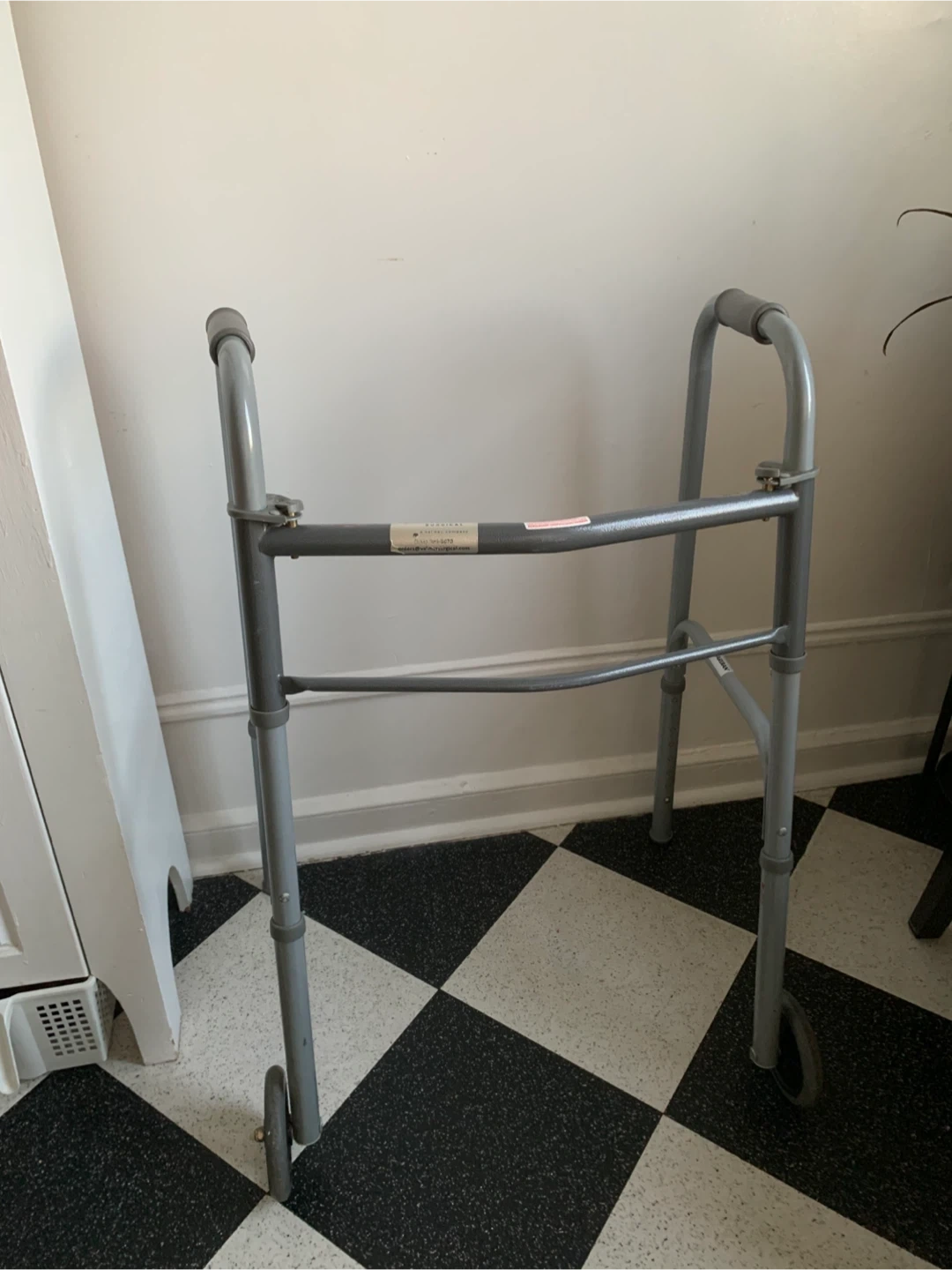 Selling a folding walker in gray. It's in good condition and ready to help someone get around. It folds up for easy storage and transport, making it super convenient
