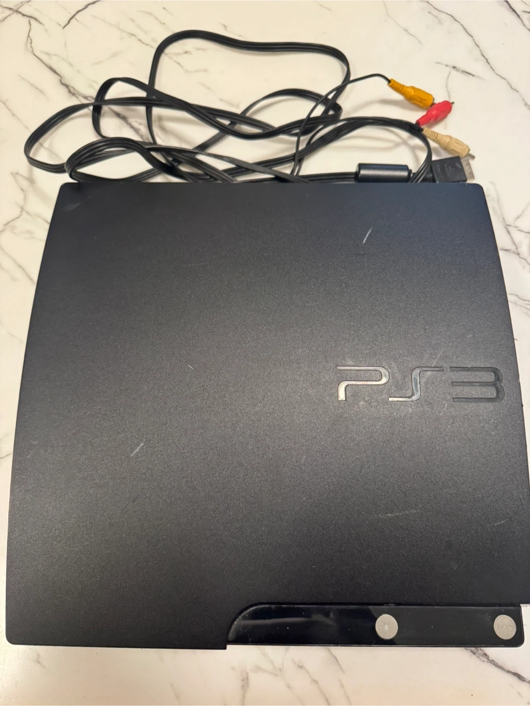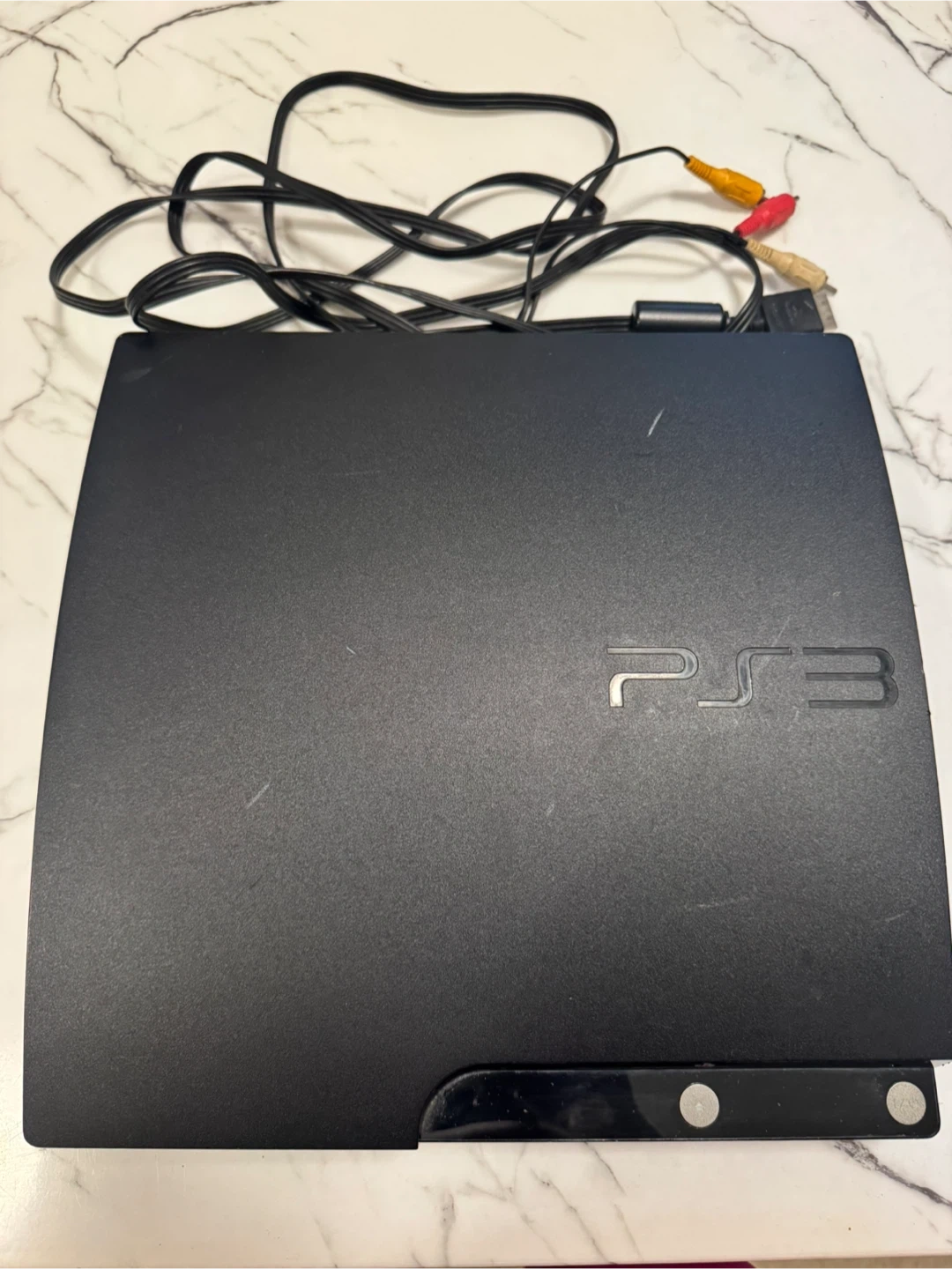 Selling a used PlayStation 3 (PS3) console in black. 120GB. It comes with all the necessary cables. There are some minor scratches on the console, but it works perfectly fine. No controller included.