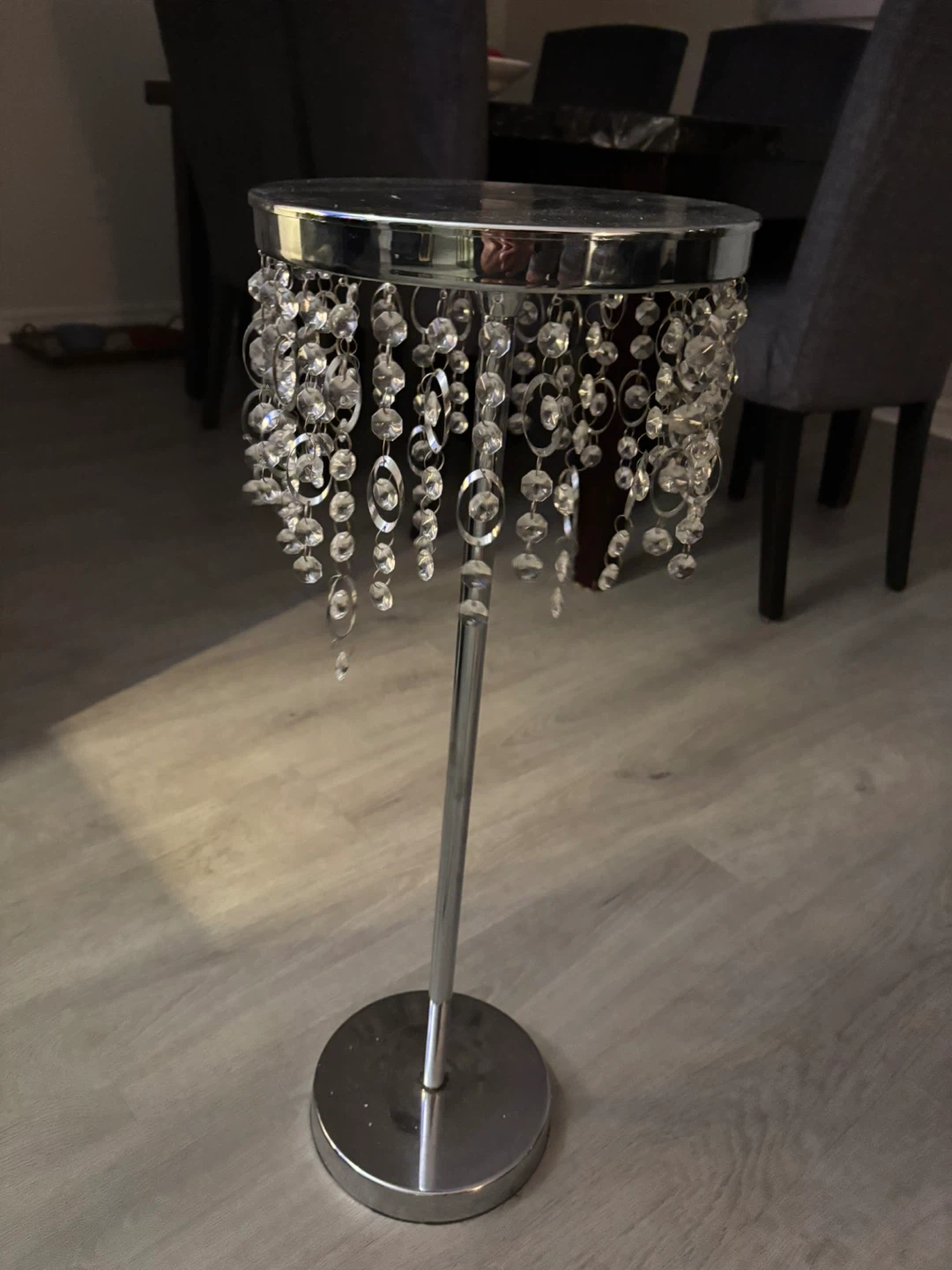 Selling a stylish silver accent table that would look great in any room! It features a sleek silver finish and is adorned with beautiful crystal beads that catch the light. Perfect for displaying plants, lamps, or other decorative items. It's in great condition and ready for a new home!