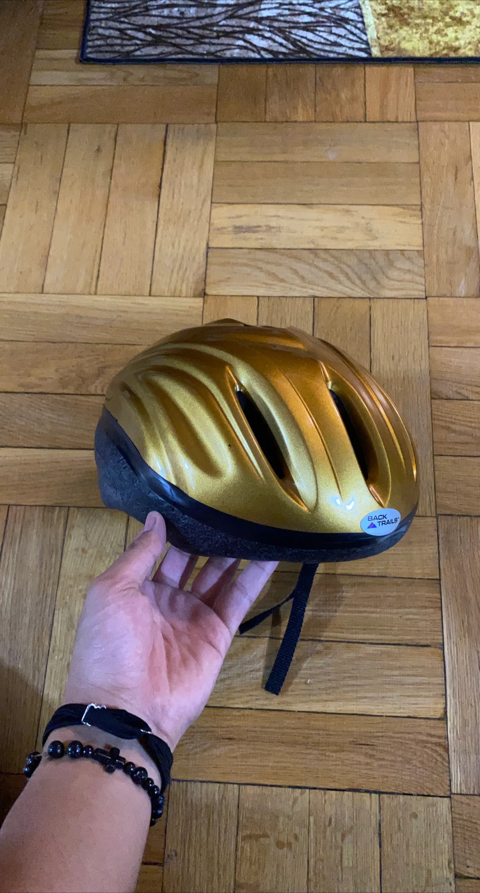 Selling a Back Trails bike helmet in gold. There is a small crack on the top, as pictured, but it's otherwise in good condition. Never been worn. Great for biking around town!
