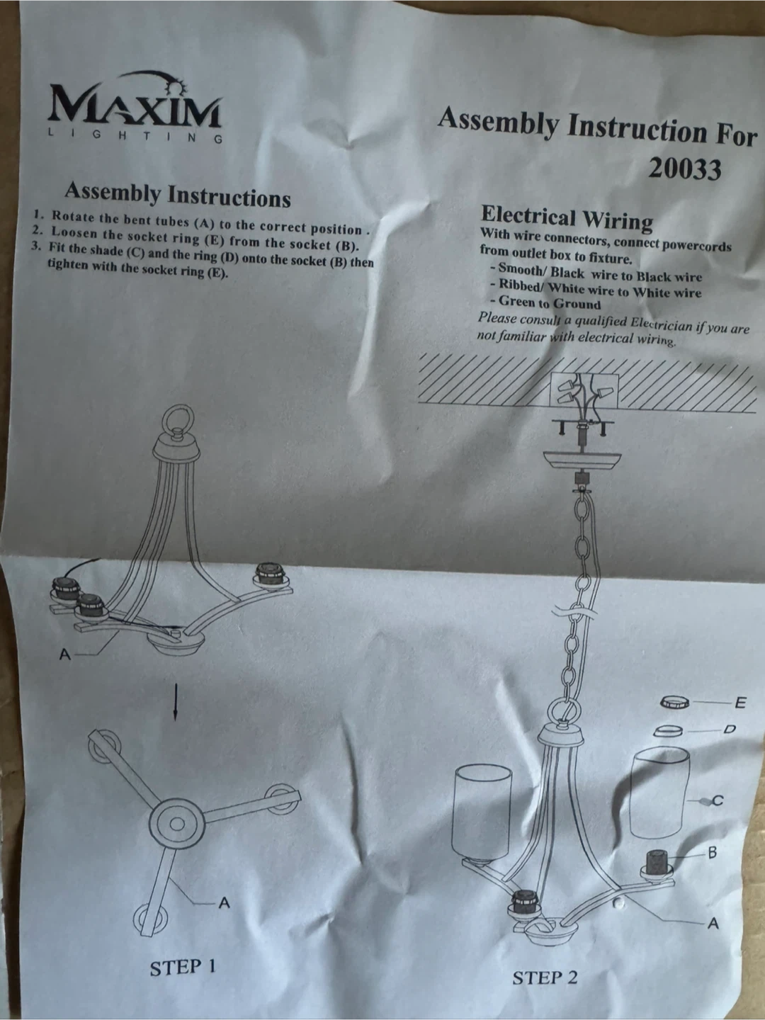 Selling a brand new Maxim Lighting chandelier, model number 20033SWOI. It's still in its original box and includes all the components. The box indicates it requires 3 * 60W-MB bulbs (not included). Assembly instructions are also included. Perfect for adding a touch of elegance to any room!